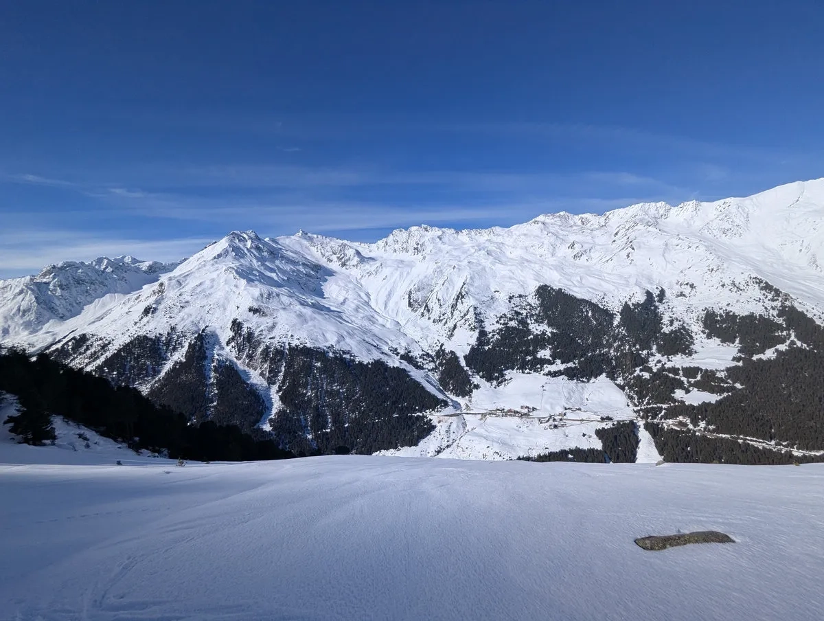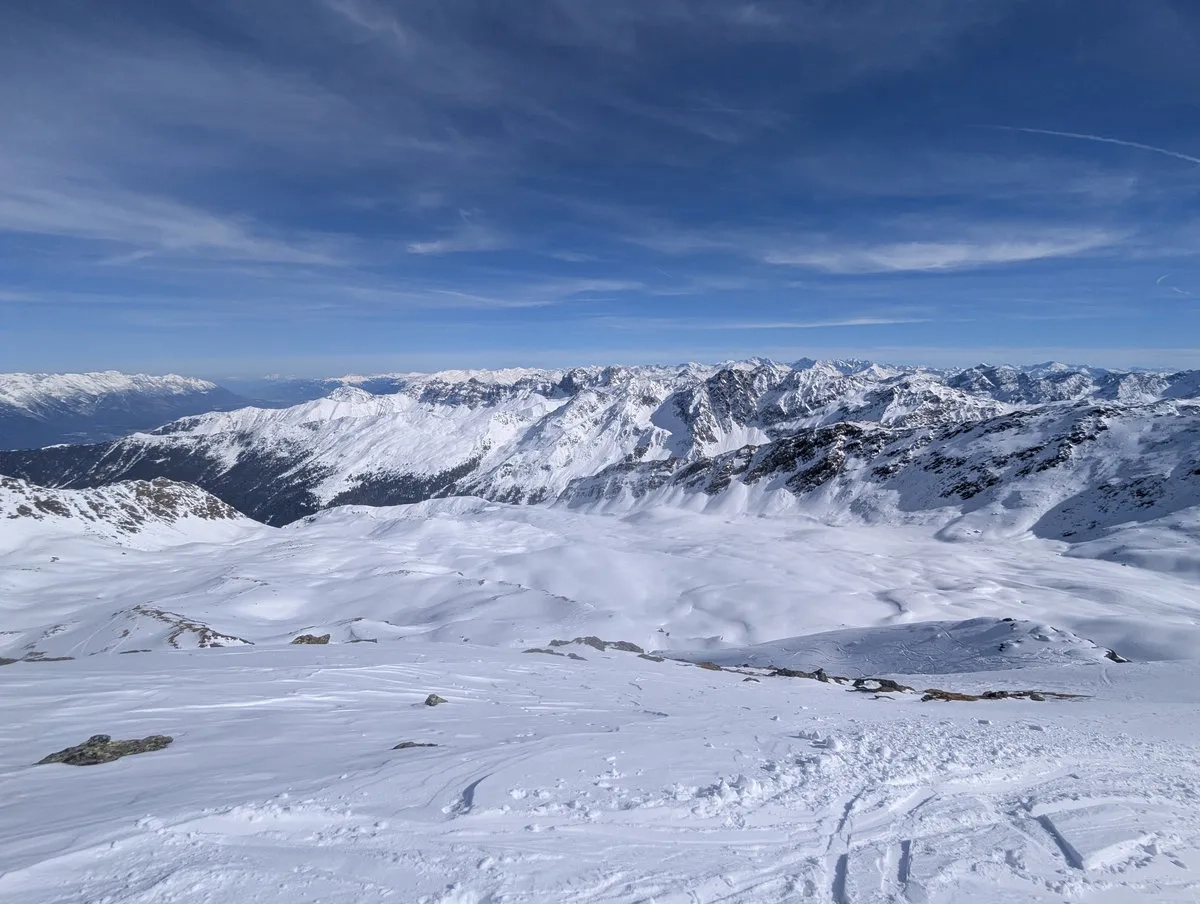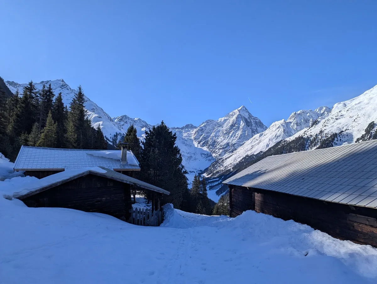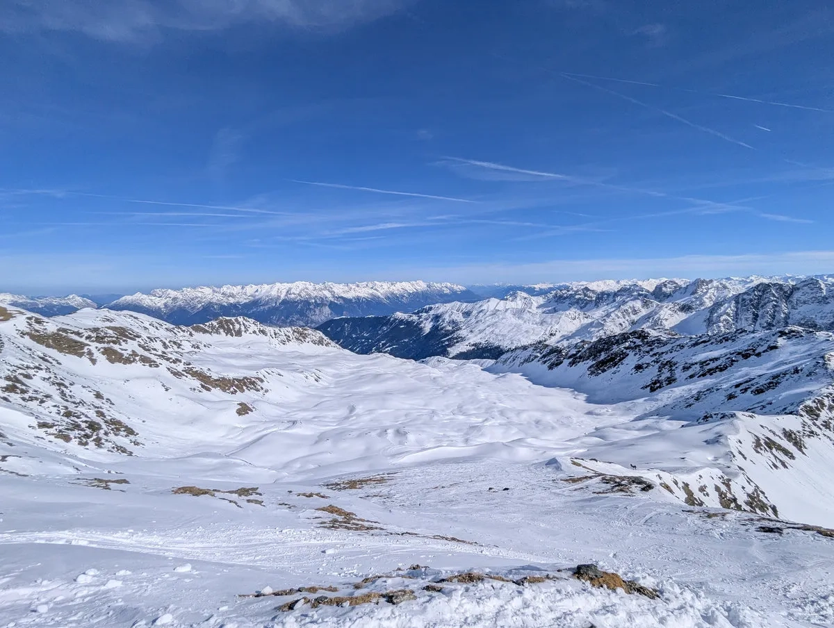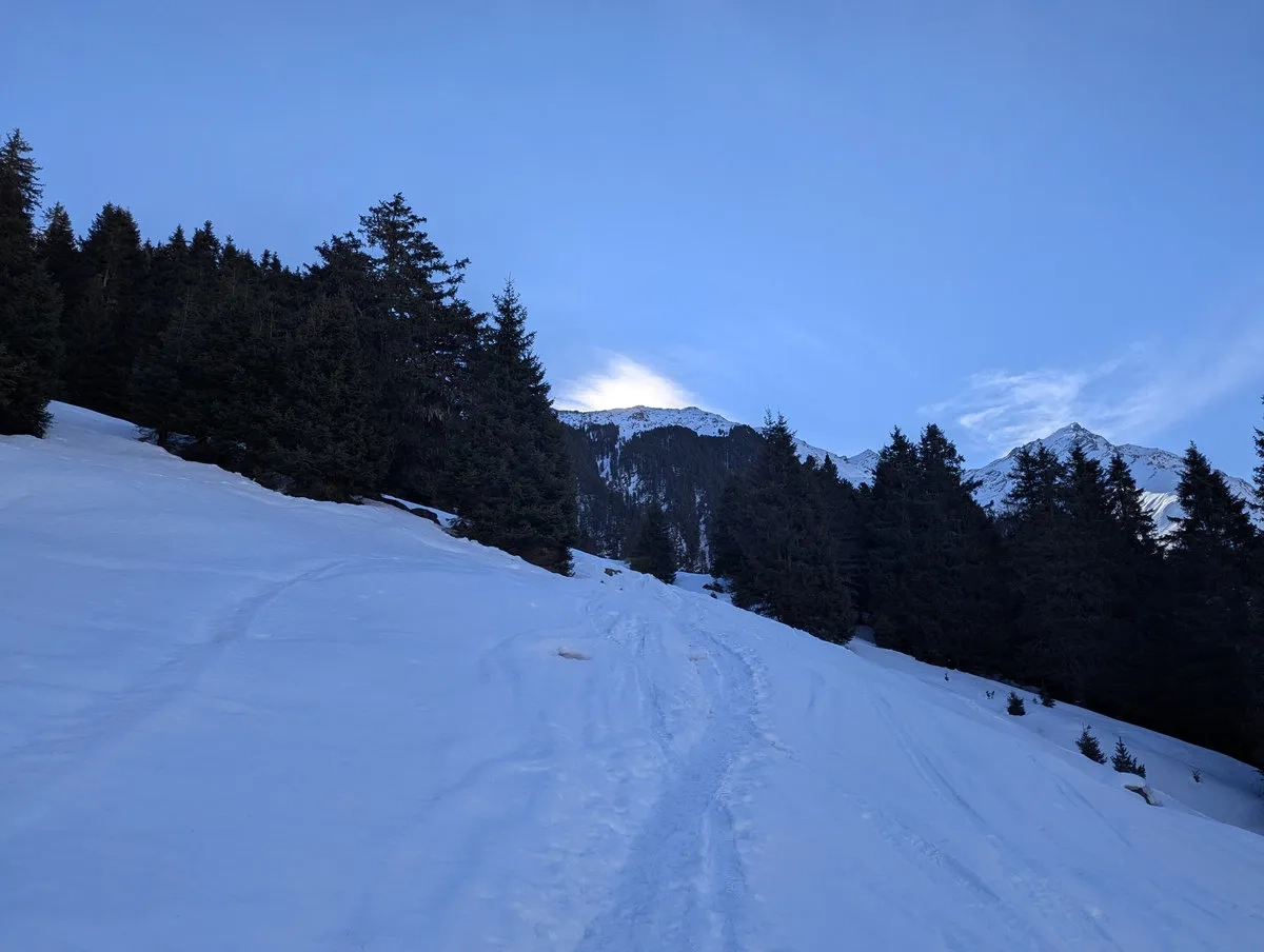 Die wohl unattraktivste Skitourenvariante führt vom Parkplatz Moos (direkt unterhalb von Praxmar) über den Westaufstieg zum Roten Kogel. Und ja, "unattraktiv" ist hier kein übertrieben dramatisches Wort, sondern eine ziemlich ehrliche Beschreibung.