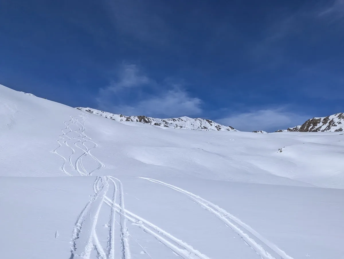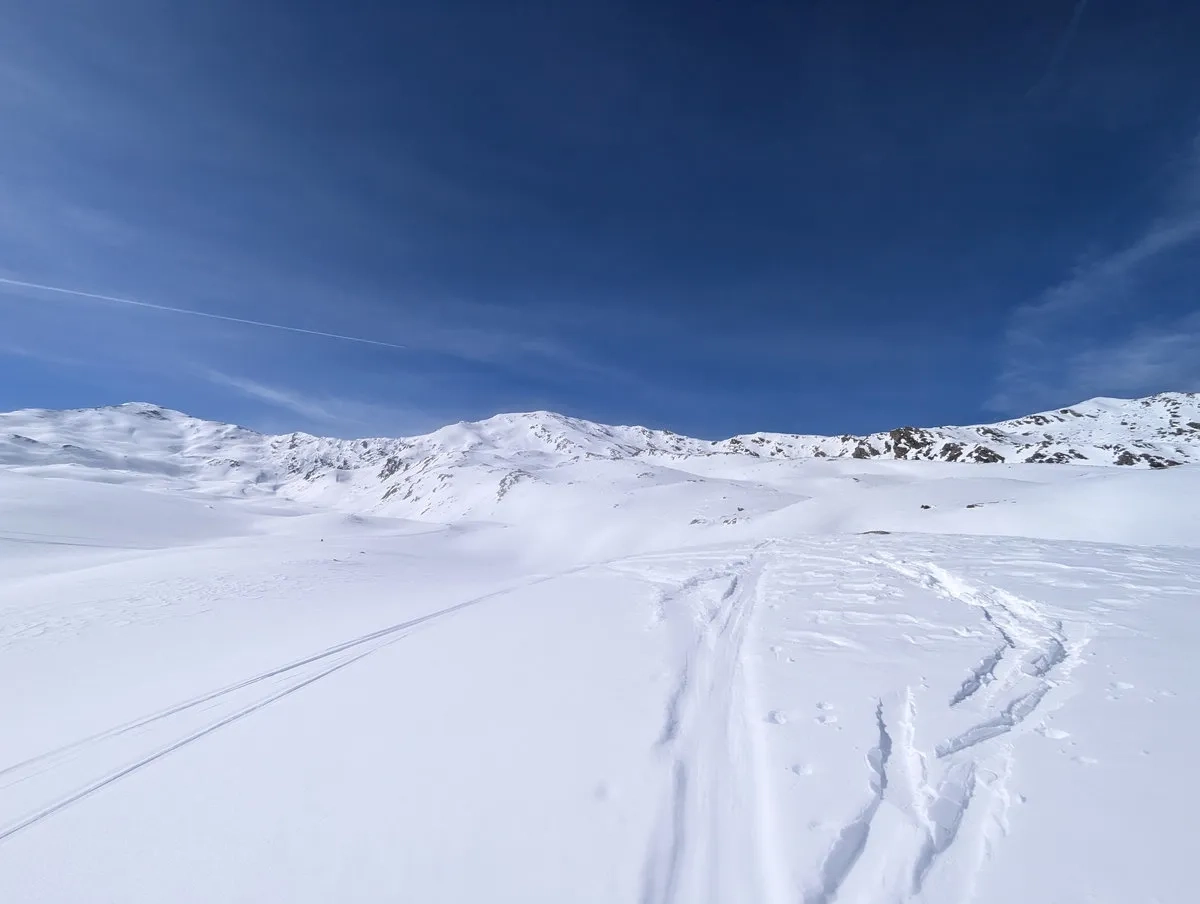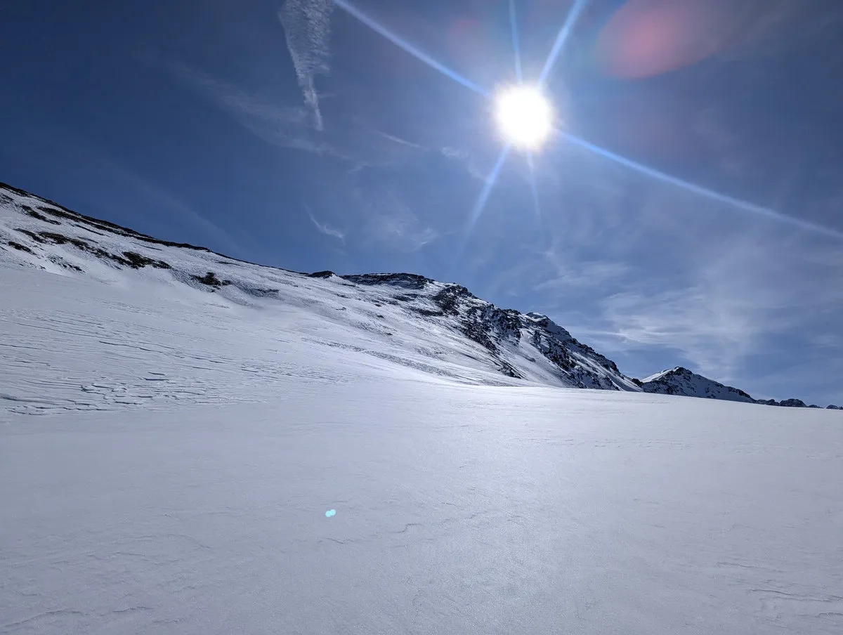 Sobald es flacher wird (nach rund 200 Höhenmetern), lässt man die Skier nach links Richtung Norden beziehungsweise Nordosten gleiten, um anschließend auf die Aufstiegsspur zum Sömen zu gelangen. Von dort fährt man später wieder nach Westen ins Tal und mit etwas Glück ist der Schnee dann auch deutlich weicher als noch beim Aufstieg.
