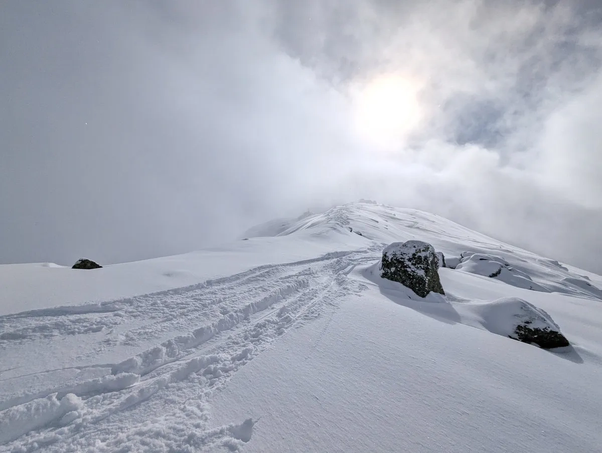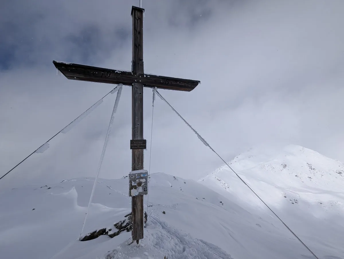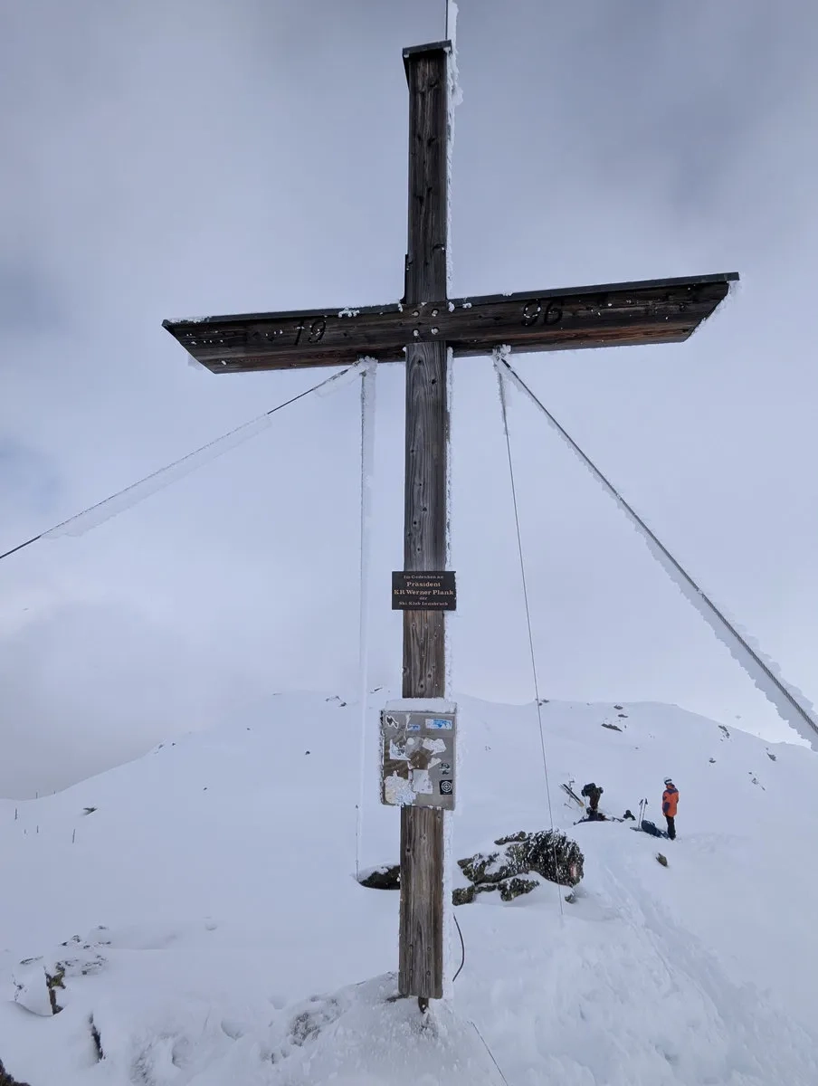 - Gipfelglück: Die letzten Meter spaziert man am breiten Gipfelkamm entlang bis zum Gipfel. Bei guter Schneelage kann man mit den Skiern bis zum Gipfelkreuz gehen und dort das obligatorische Gipfel-Selfie schießen.