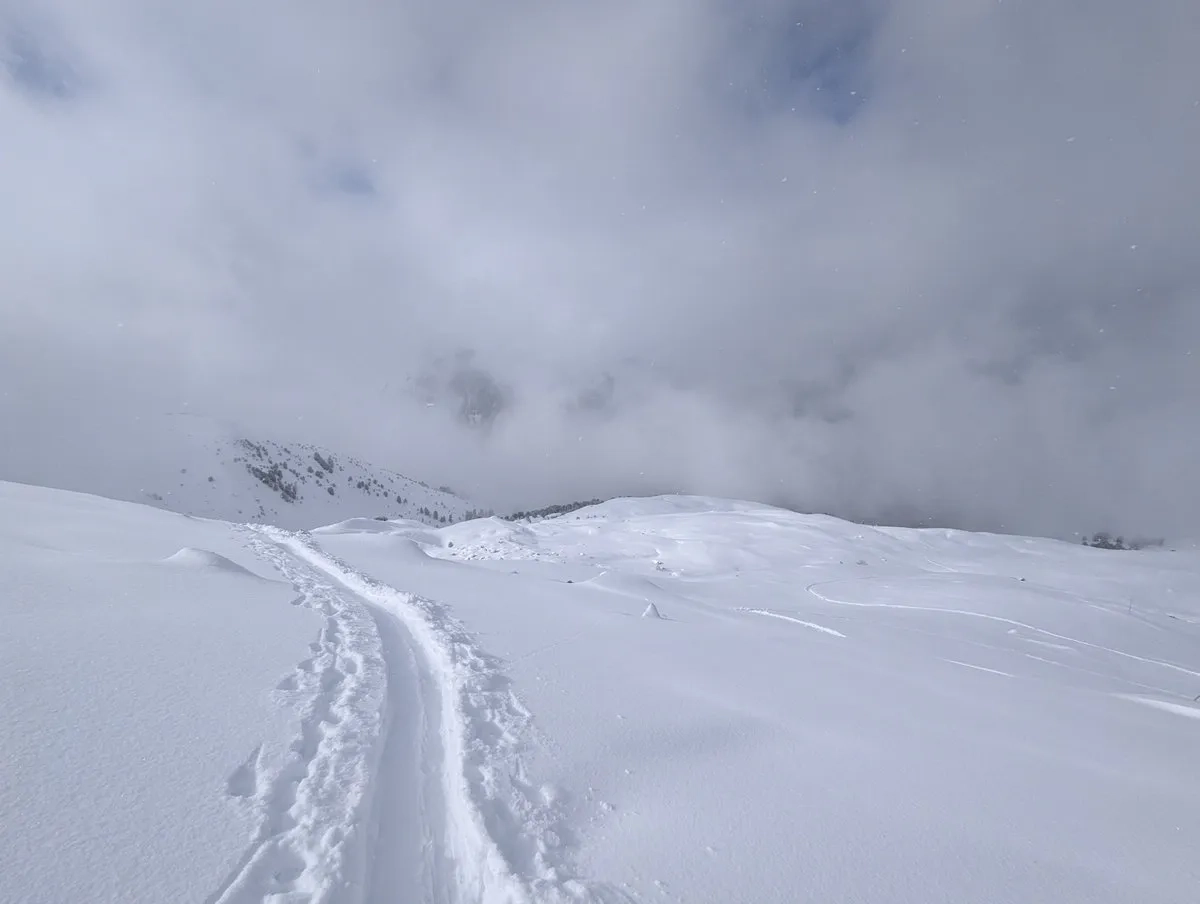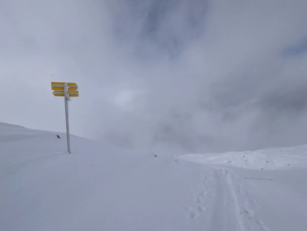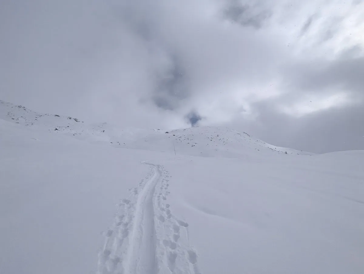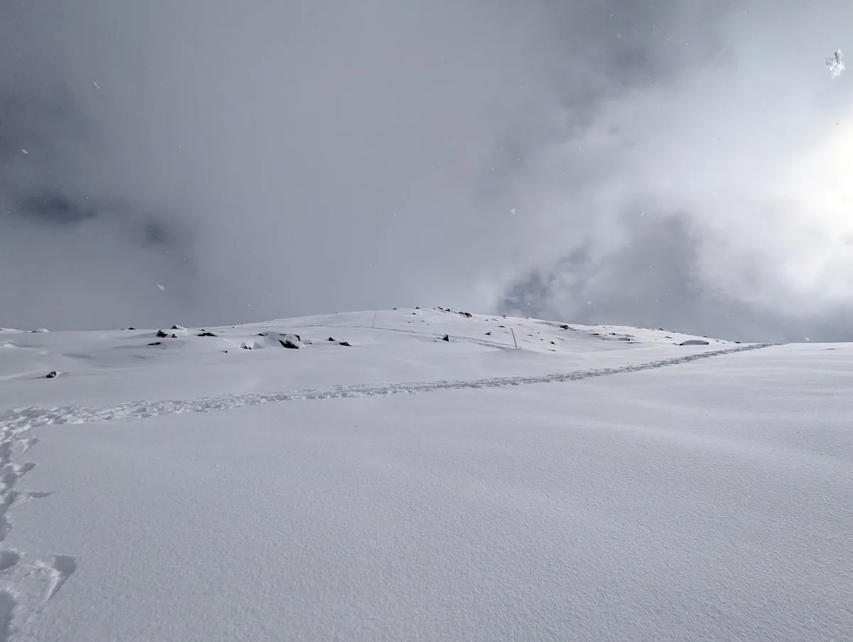 - Gipfelglück: Die letzten Meter spaziert man am breiten Gipfelkamm entlang bis zum Gipfel. Bei guter Schneelage kann man mit den Skiern bis zum Gipfelkreuz gehen und dort das obligatorische Gipfel-Selfie schießen.