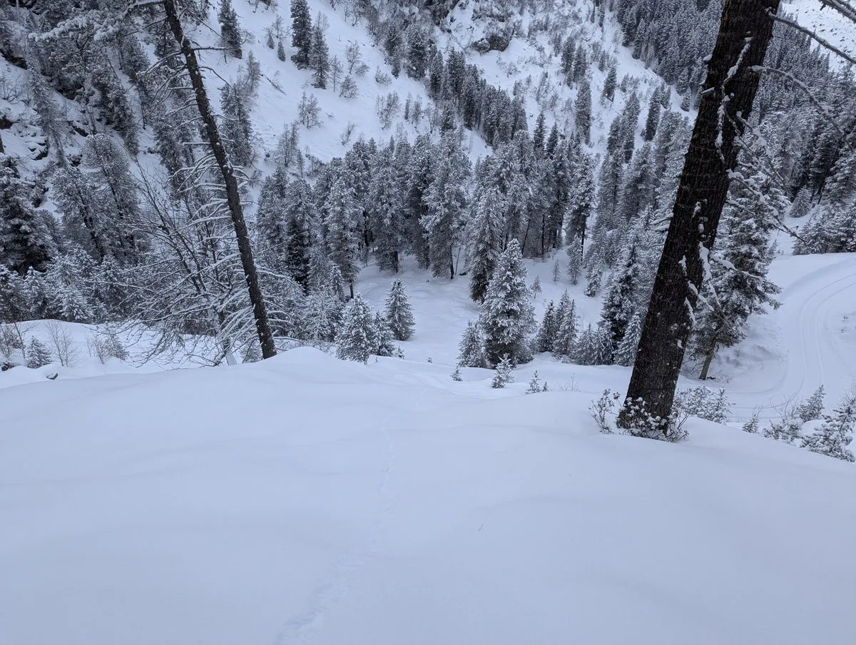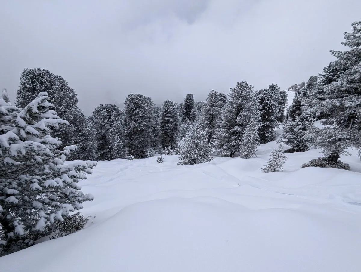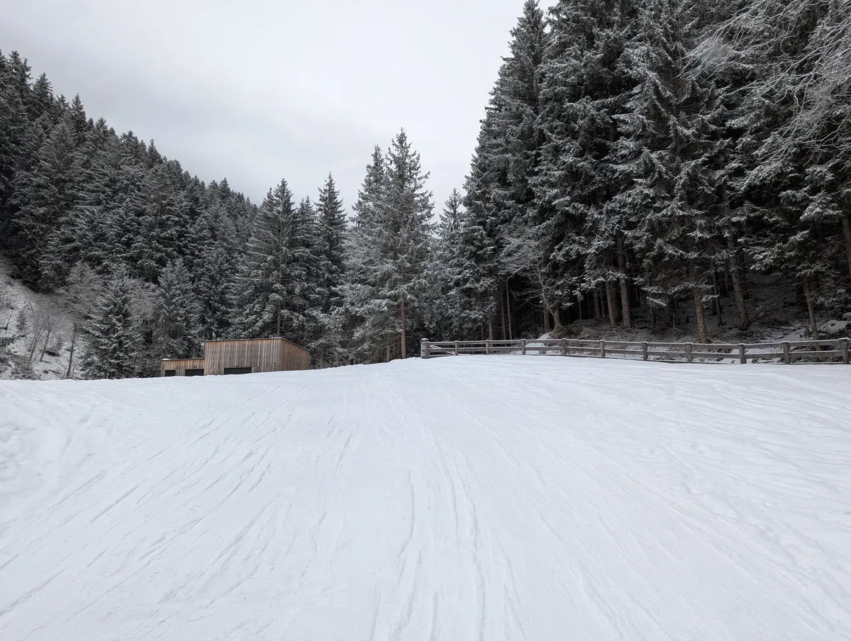 - Die Kür (Abfahrt): Bergab gibt es im breiten Terrain vielfältige Varianten. Wer Tree Runs liebt, hält sich kurz vor der Furgges Alm weiter südlich (also nicht nach rechts queren) und pflügt durch den Wald bergab Richtung Forststraße.