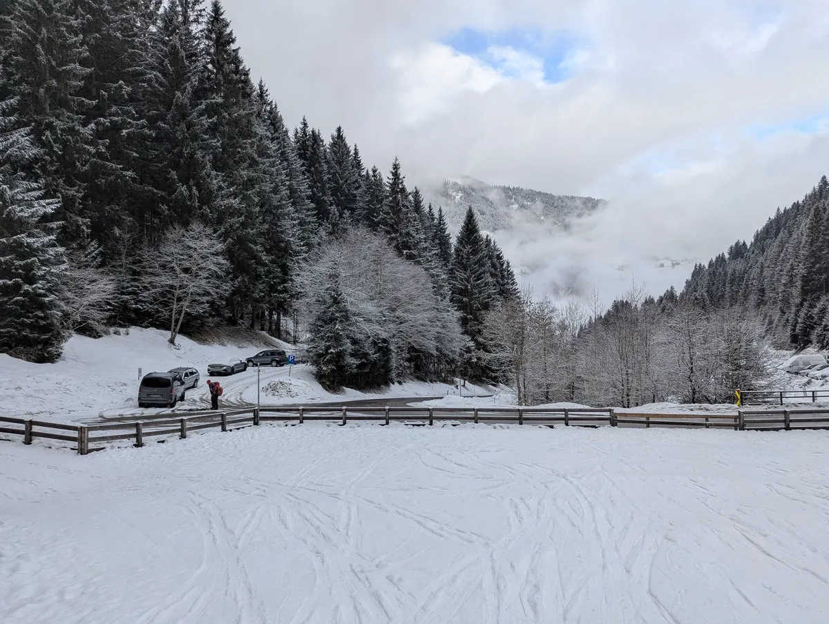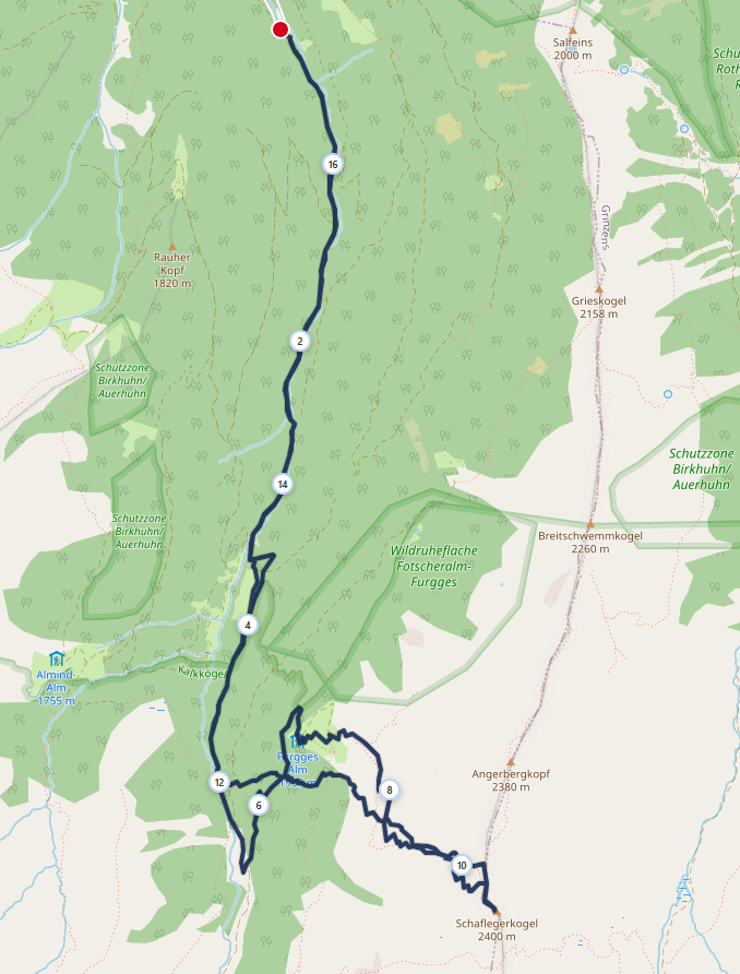 - Alm-Hopping: Links vorbei an der Weidenalm weiter der Forststraße folgen, welche kurz danach in einen Rechtsbogen Richtung Süden führt. Nun in einigen Kehren auf einer Forststraße weiter zur Furgges Alm. Wer es eiliger hat oder die Waden brennen lassen will: Es gibt oft gespurte Aufstiegswege durch den Wald (Abkürzungen für Motivierte).