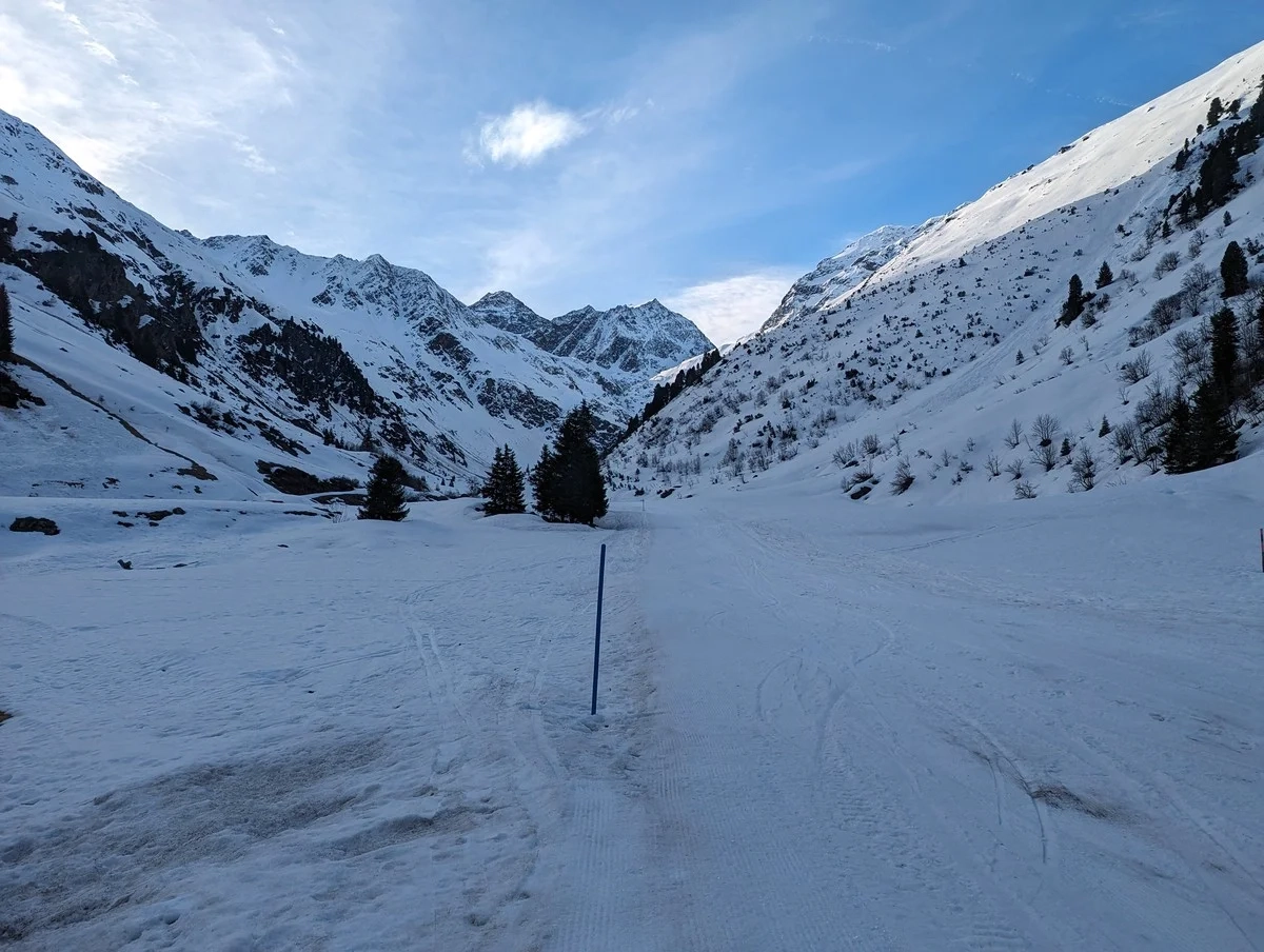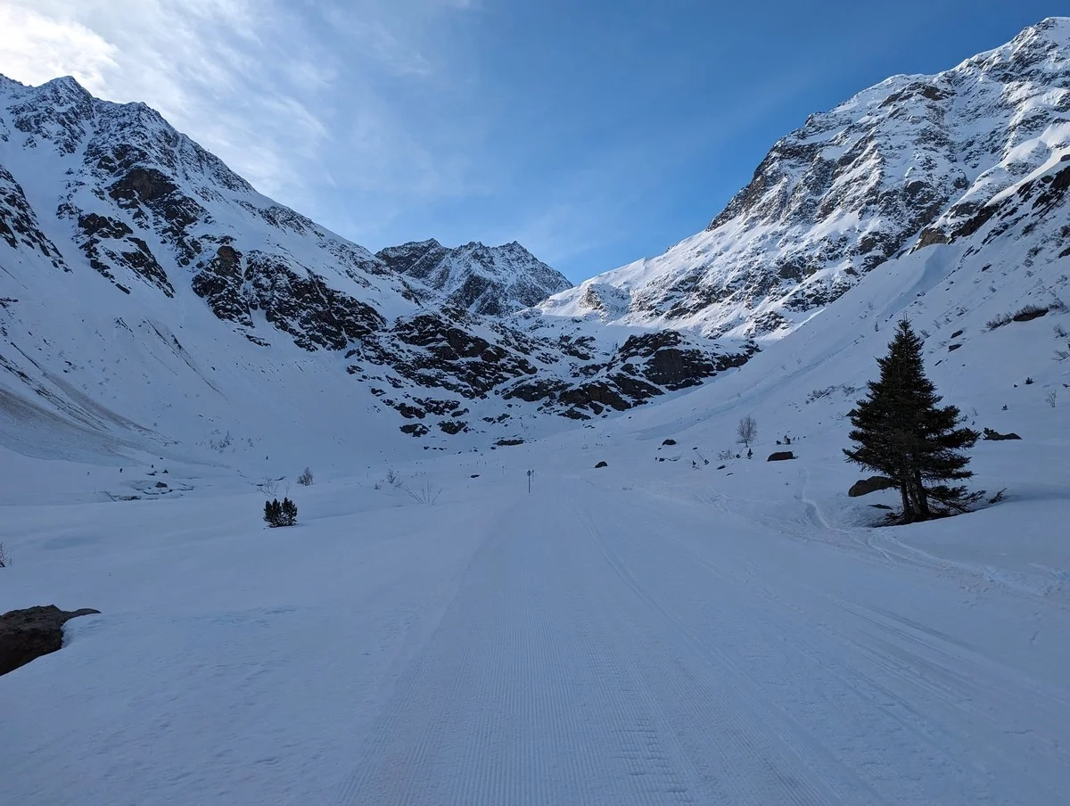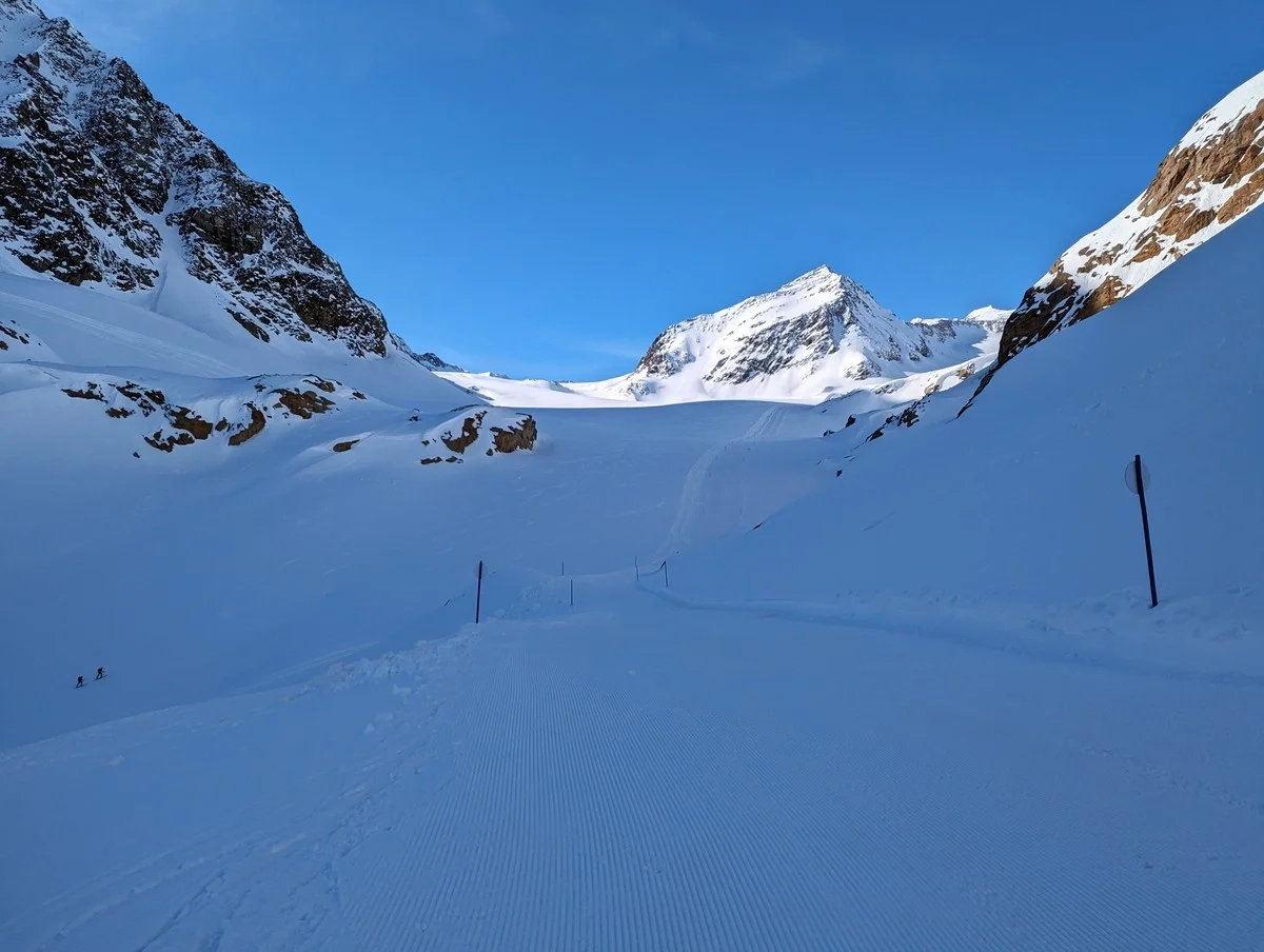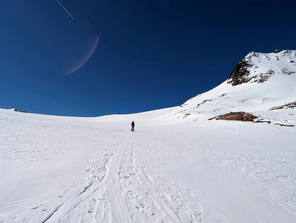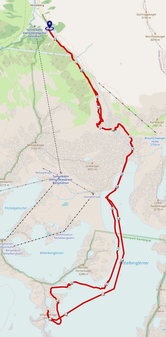 • Aufstieg über die Notabfahrt (ca. 940 Höhenmeter, durchgehend einfach), bis der Mittelbergferner bei der Höhen-Langlaufloipe am Rande des Skigebiets Pitztaler Gletscher erreicht wird. Dieser Abschnitt kann auch mit der Bergbahn abgekürzt werden. Dazu fahrt ihr mit der "Tunnelbahn Gletscherexpress" in das Skigebiet und dort über die rote Piste Nr. 25 zur Talstation der Mittelbergbahn und bei dieser noch ein Stück bergab zum Beginn der Notabfahrt bzw. der Langlauf-Höhenloipe am Mittelbergferner.