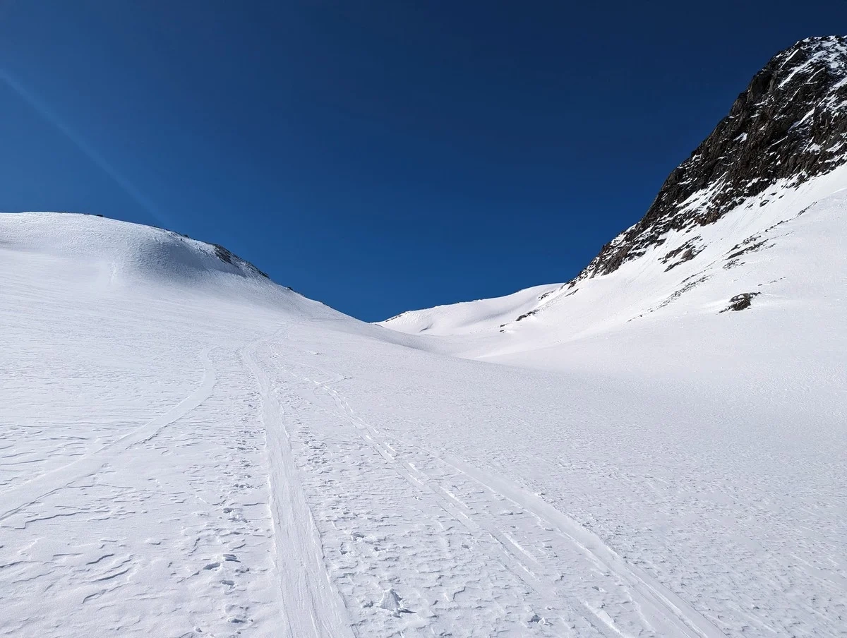Geringe Lawinengefahr. Einzig der Schlusshang ist etwas anfälliger.