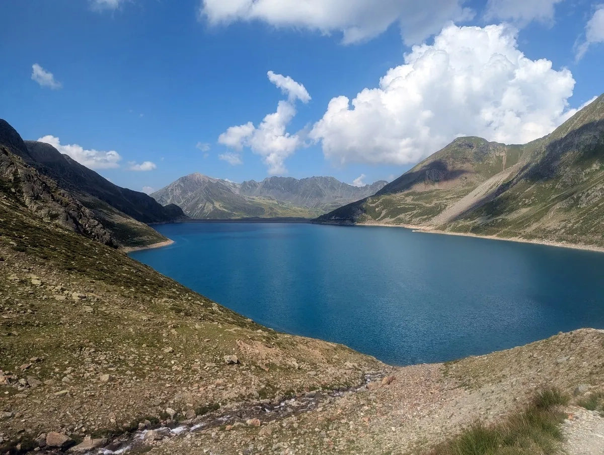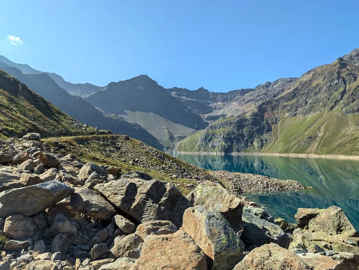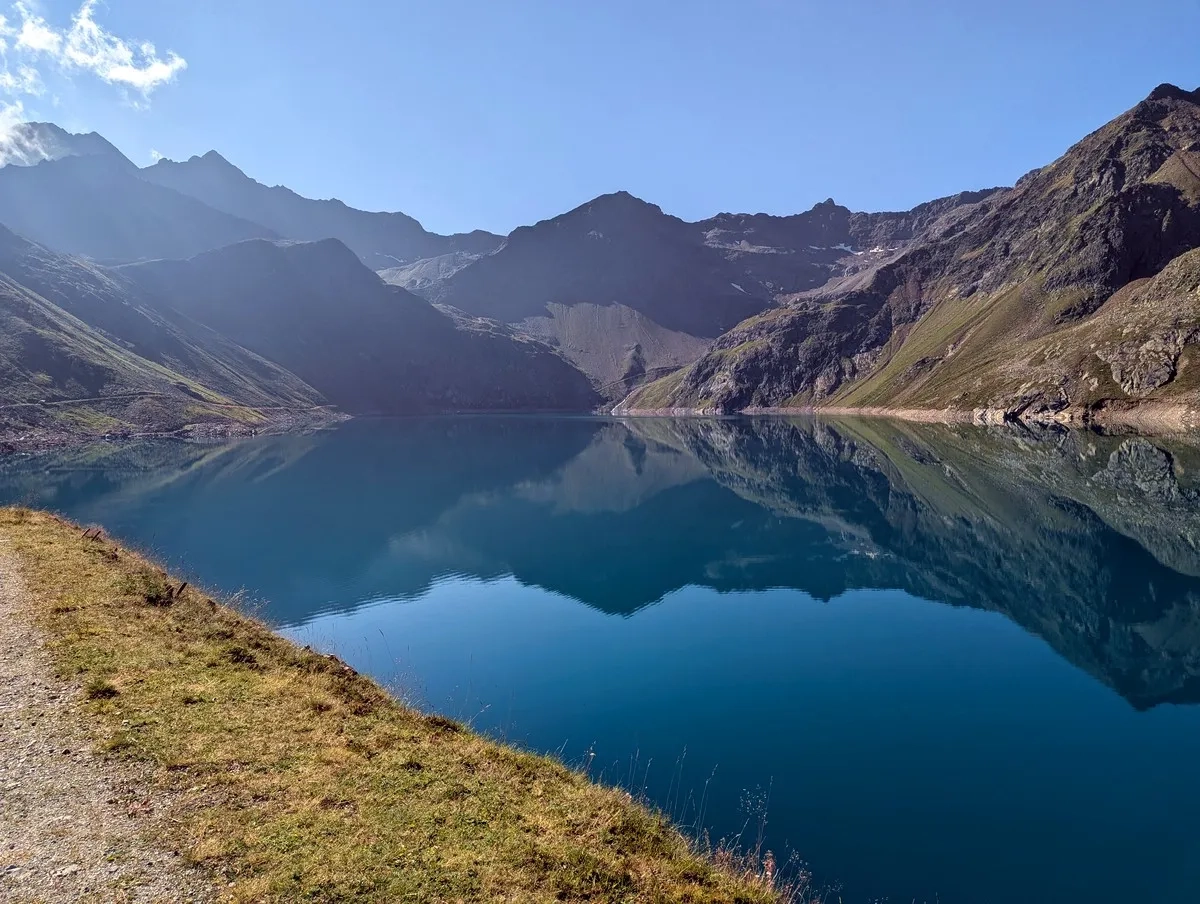 - Anschließend geht es entlang des etwa 2 Kilometer langen, flachen Abschnitts am Nordufer des Speichersees weiter. Diese Strecke bietet einen herrlichen Blick auf das tiefblaue Wasser des Sees und die umliegenden Berge.