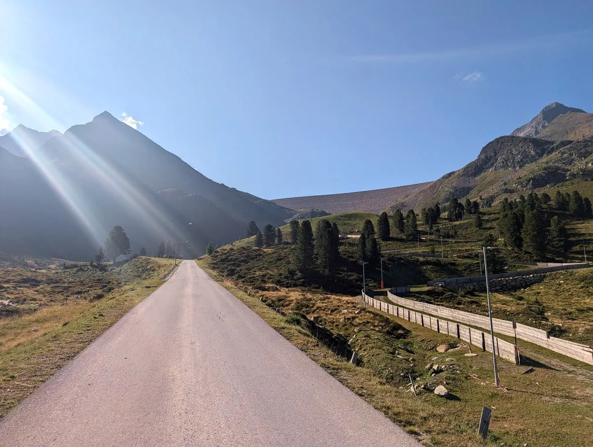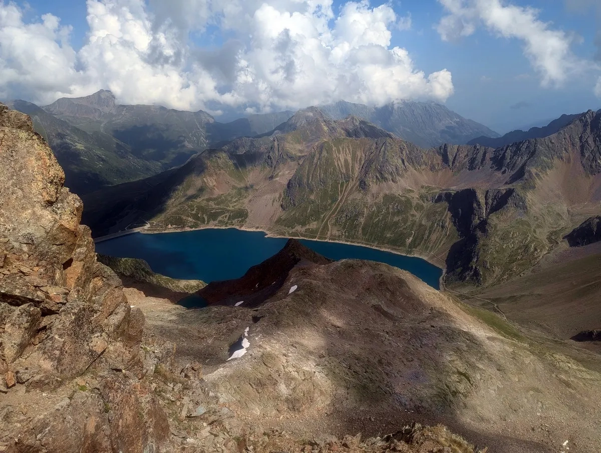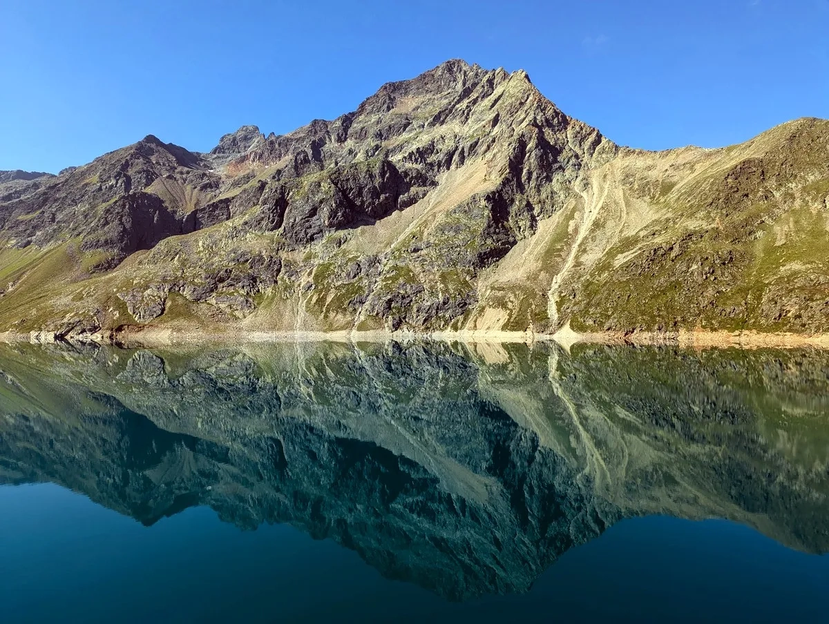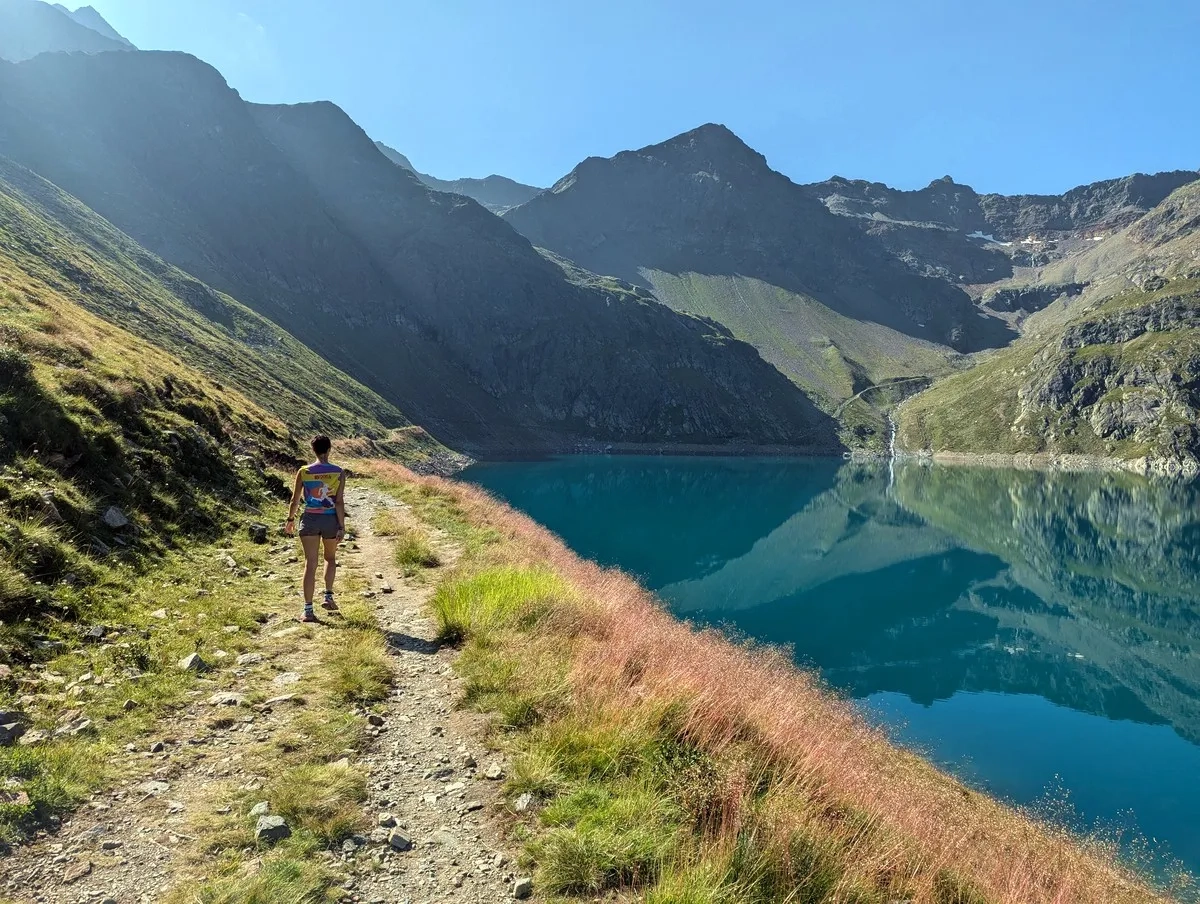 - Anschließend geht es entlang des etwa 2 Kilometer langen, flachen Abschnitts am Nordufer des Speichersees weiter. Diese Strecke bietet einen herrlichen Blick auf das tiefblaue Wasser des Sees und die umliegenden Berge.
