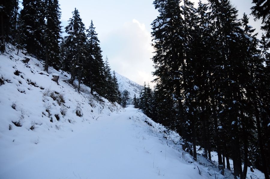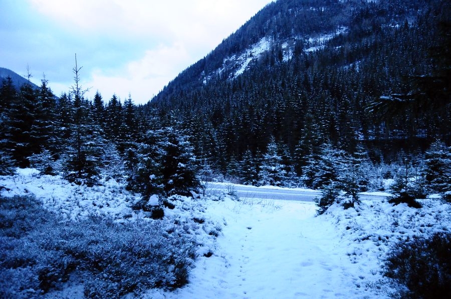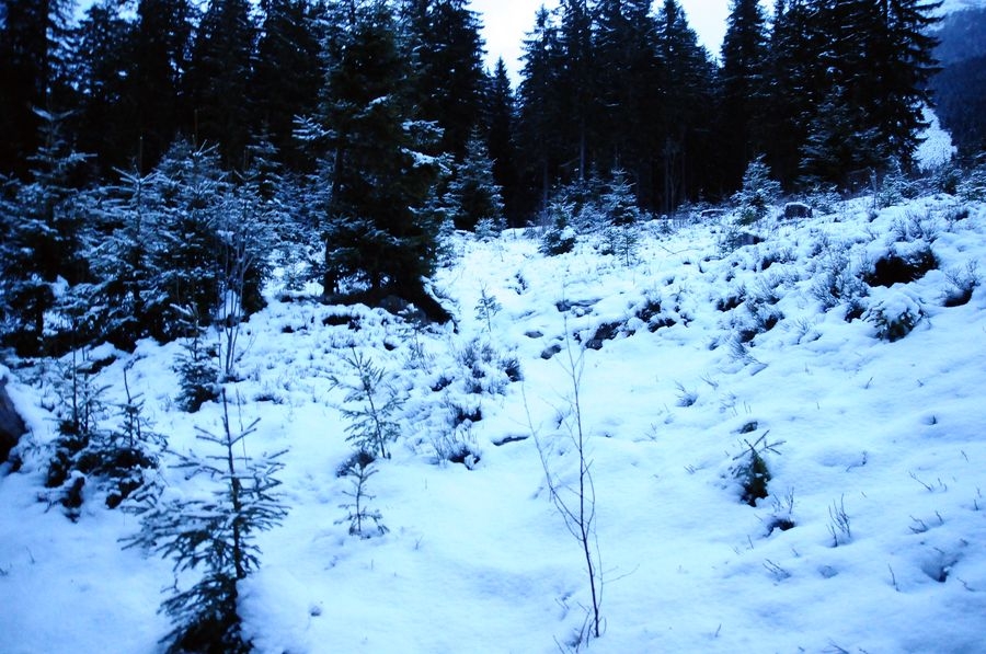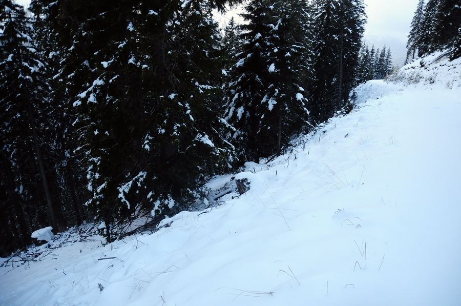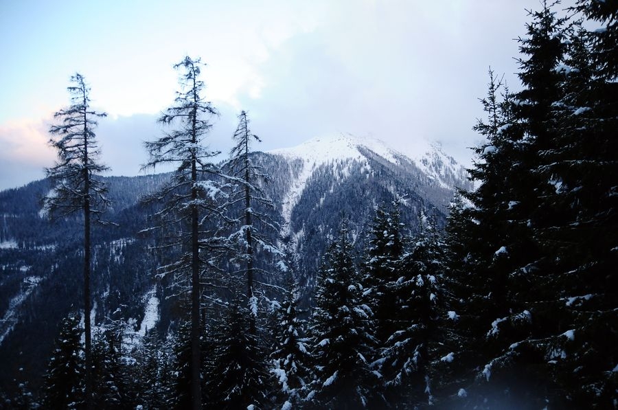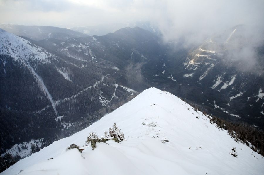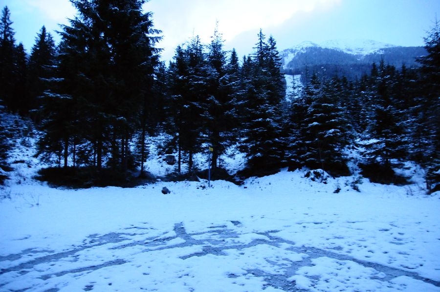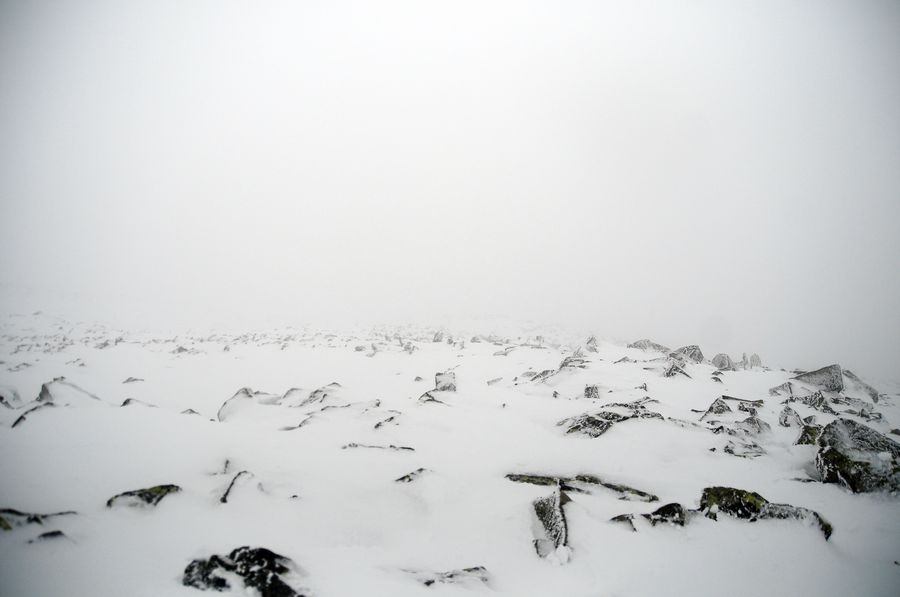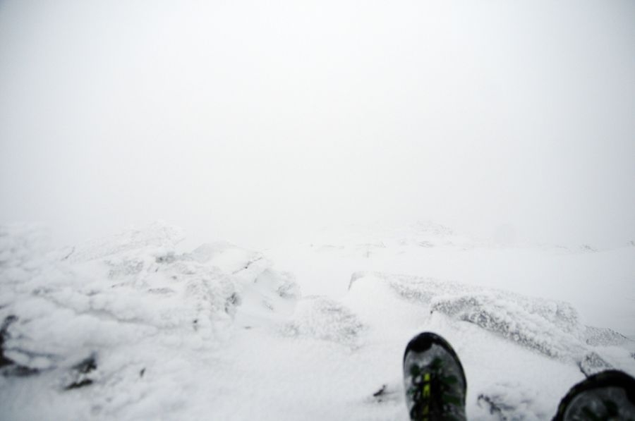 Bis dahin verlief die Wanderung reibungslos, bin ich doch immerhin nicht von der Route abgekommen. Aber nach oben möchte ich nicht blicken. Je weiter es nach oben geht, desto näher komme ich einer dichten Wolken-/Nebeldecke. Einen Gipfel sehe ich die ganze Route nicht. Als ich dann die letzten Bäume passiert habe wird es richtig knifflig. Die Sicht wird immer kürzer und der Wind immer stärker. Meine Handschuhe sind leider schon etwas beschädigt sodass meine Finger sehr schnell zu frieren beginnen. Ansonsten komme ich mit den Bedingungen gut zurecht. Nur voran komme ich nur sehr langsam. Der Schnee geht bis ca. auf die Knie, jeder Schritt kostet ordentlich Kraft. Zumal muss ich immer wieder über leicht vereiste kleine Felsen klettern um am Weg zu bleiben.