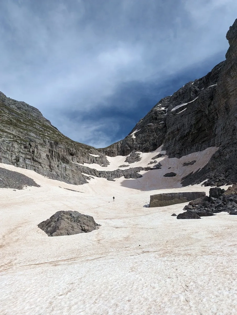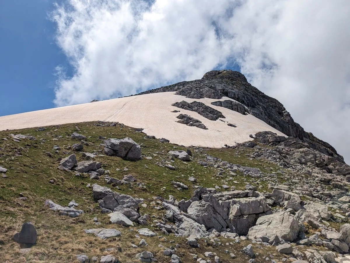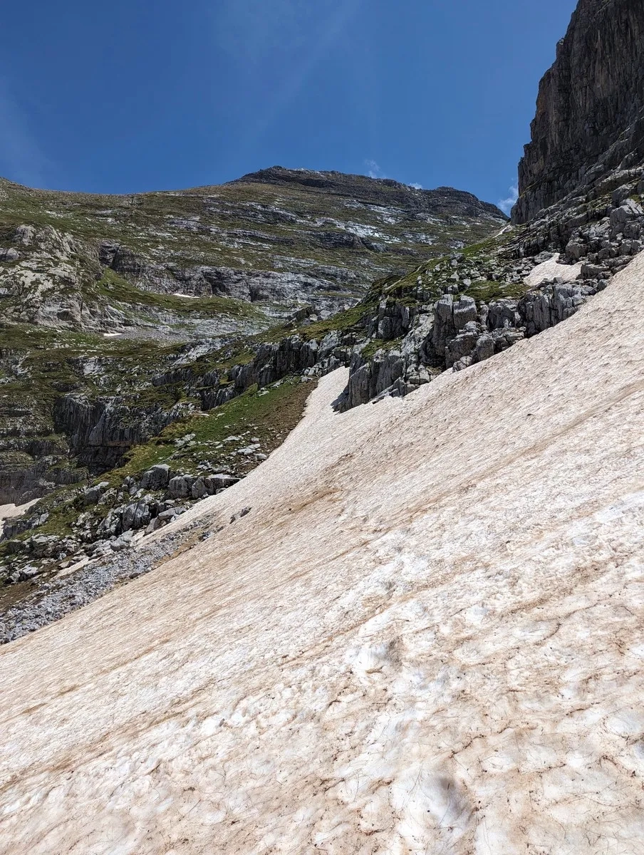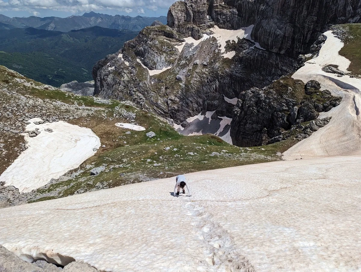 Zla Kolata Wanderung 24: Ein steileres Schneefeld im Frühsommer. Könnte man auch links einfacher umgehen.