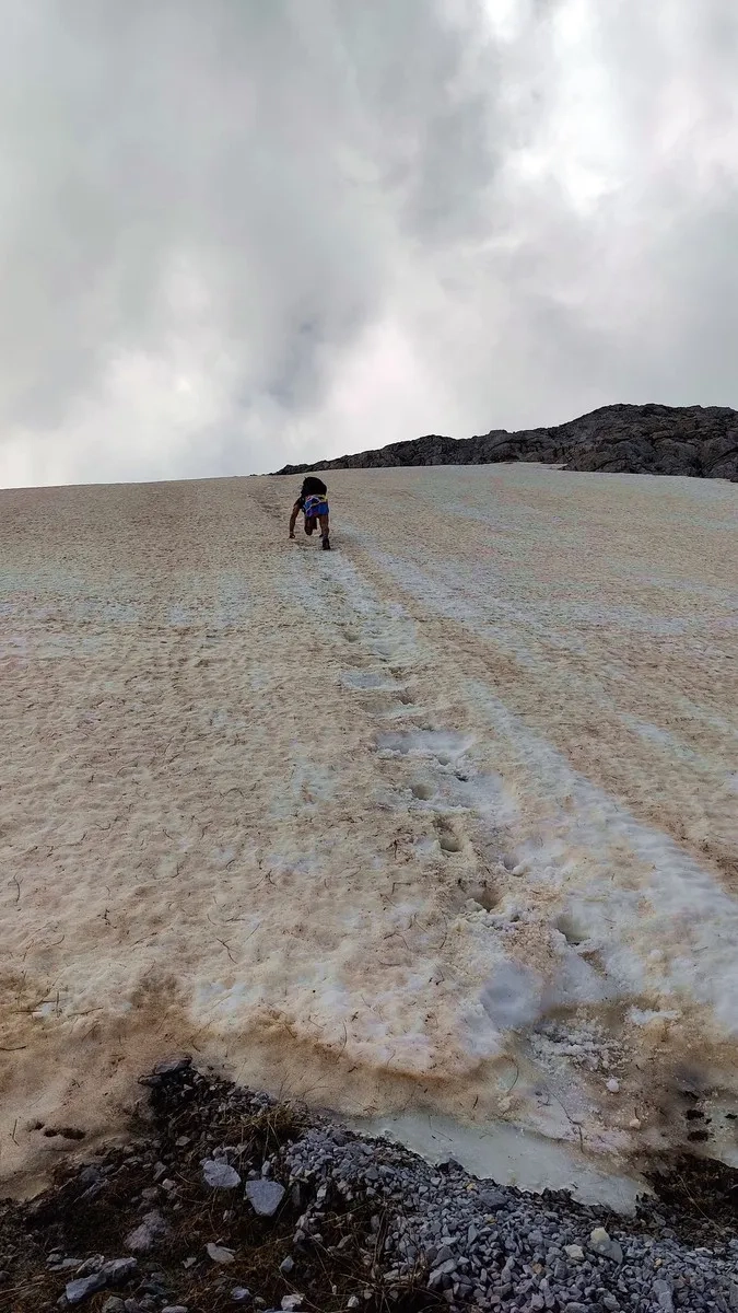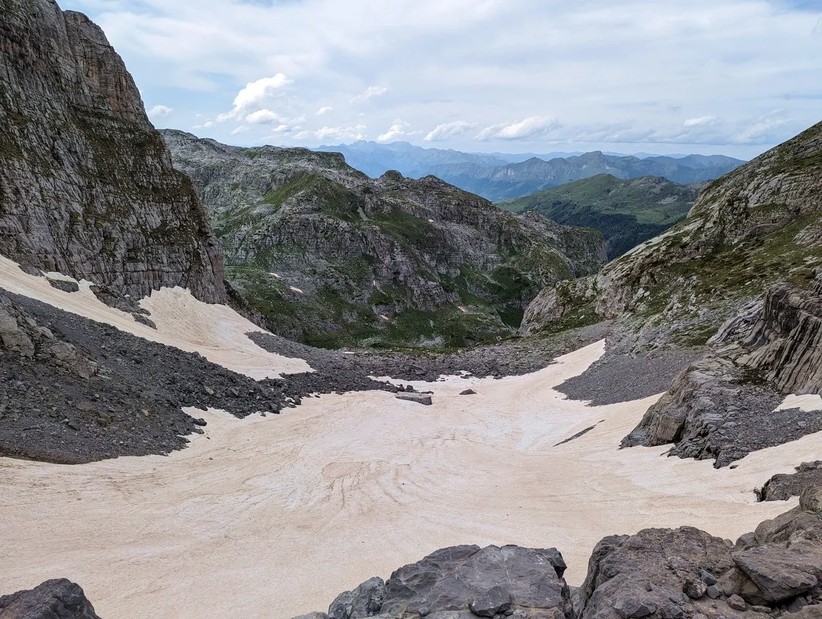 Zla Kolata Wanderung 22: Blick zurück im Aufstieg. Beim Abstieg kann man über das Schneefeld auch sitzend herunter rutschen, da es darunter abflacht.