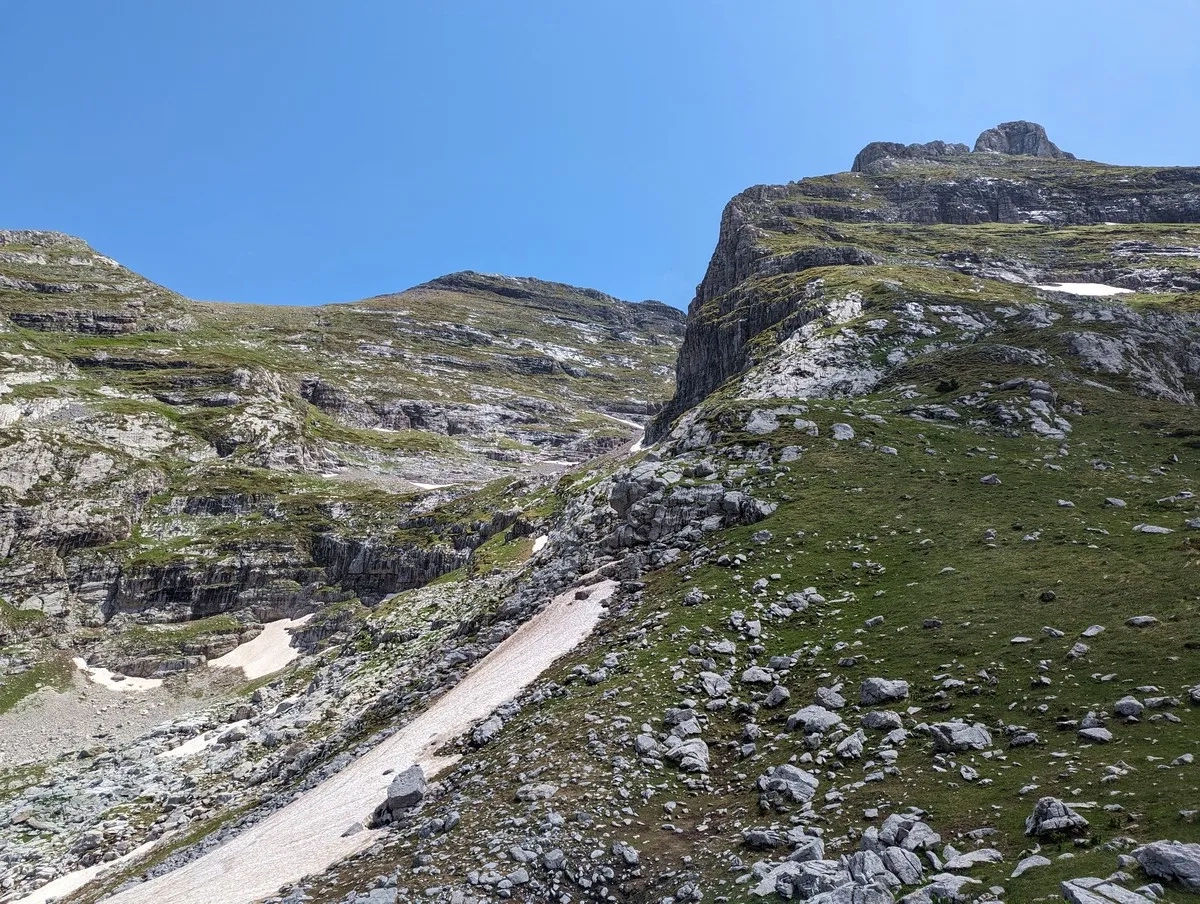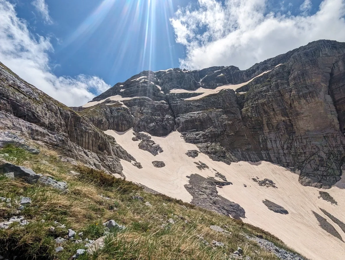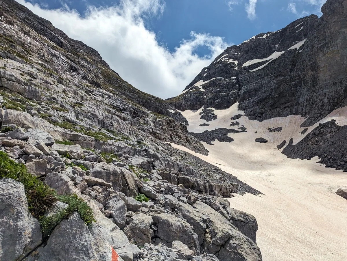 Zla Kolata Wanderung 32: Blick zurück auf das Schneefeld. Links im Felsgelände wäre die Standardroute.