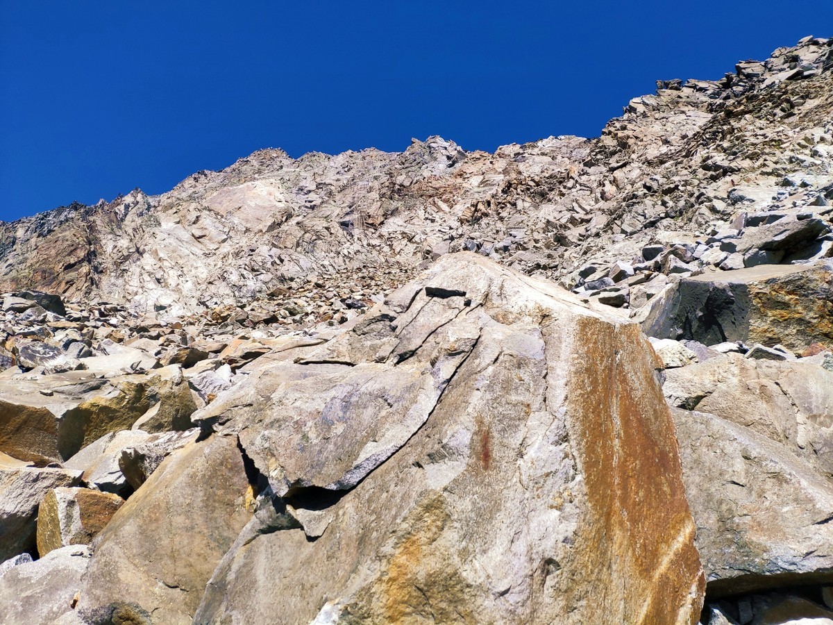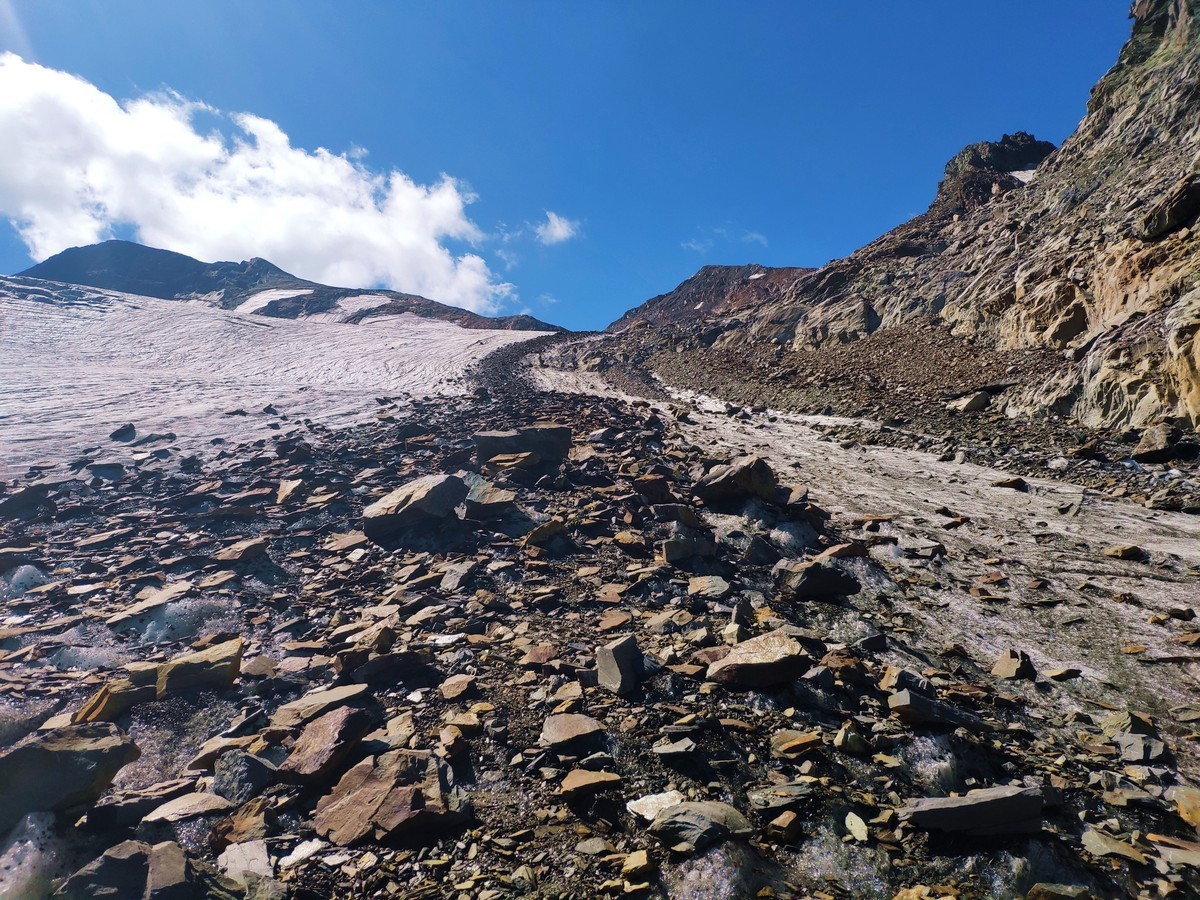 • Auf etwa 2.880 Metern rechts abbiegen und weiter bergauf über den Gletscherrand (links) oder die Steine (rechts).