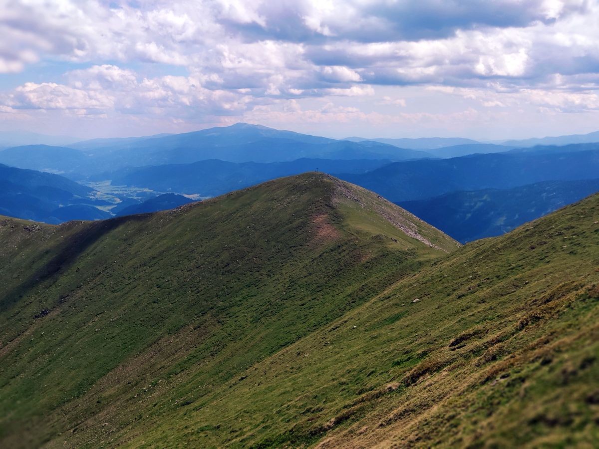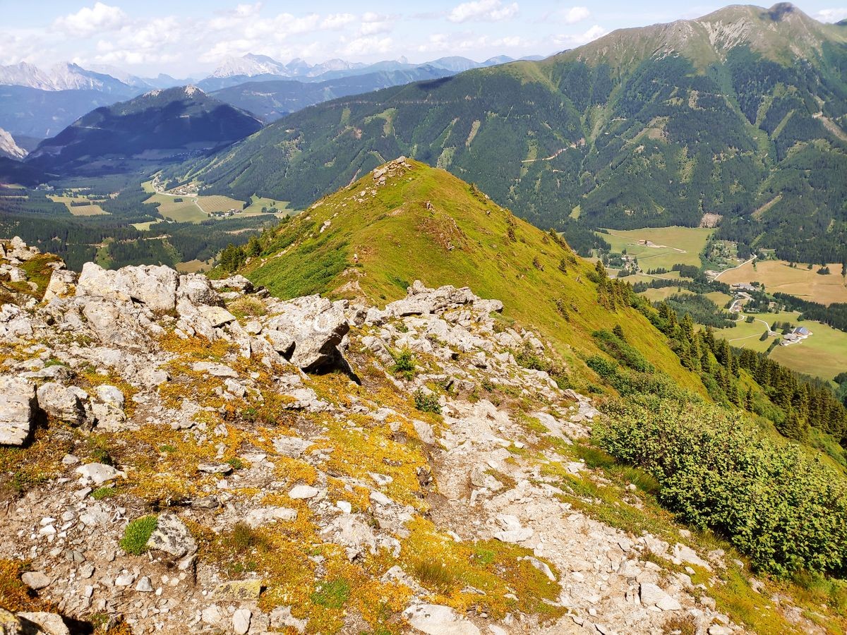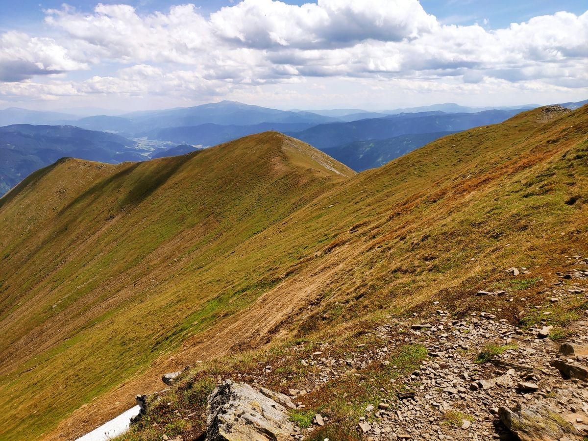 - Nach dem Zinkenkogel beginnt die sehr lange Kammwanderung über den Steinwandkogel und Schüttnerkogel zum Bruderkogel. Am Besten hält man sich immer direkt ganz oben am Grat/Kamm. Oft sind Pfadspuren zu sehen, die aber weiter rechts vom Kamm abweichen und gelegentlich auch plötzlich enden.