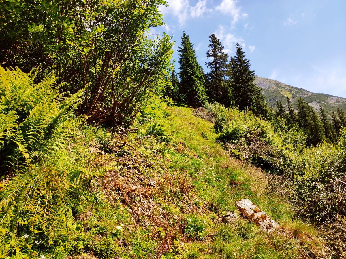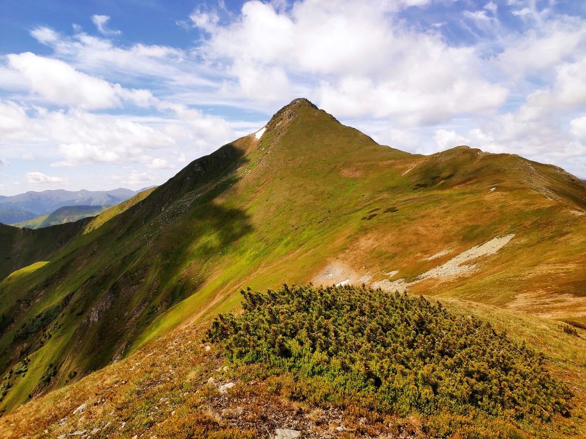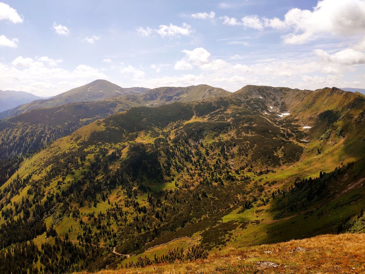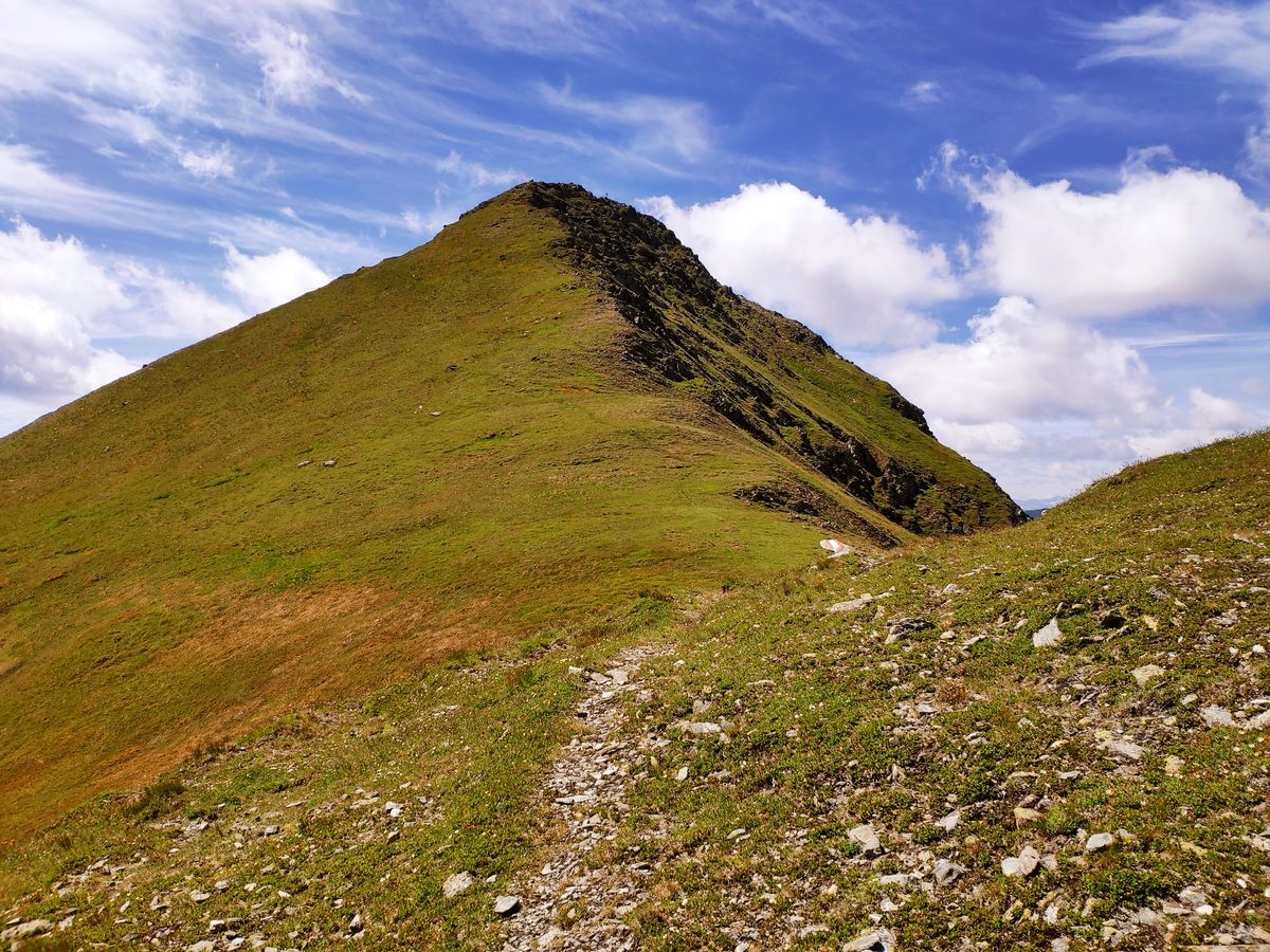 - Nach dem Zinkenkogel beginnt die sehr lange Kammwanderung über den Steinwandkogel und Schüttnerkogel zum Bruderkogel. Am Besten hält man sich immer direkt ganz oben am Grat/Kamm. Oft sind Pfadspuren zu sehen, die aber weiter rechts vom Kamm abweichen und gelegentlich auch plötzlich enden.