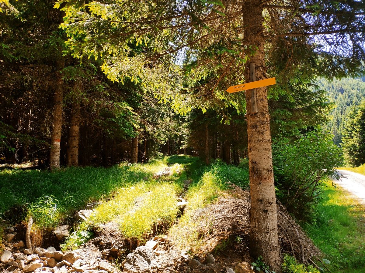 - Nun dem Pölsenweg ein Stück folgen bis die Straße nach links und rechts abzweigt. Man bleibt nun weiter rechts am Pölsenweg. Links würde man auf direktem Wege zum Bruderkogel kommen.