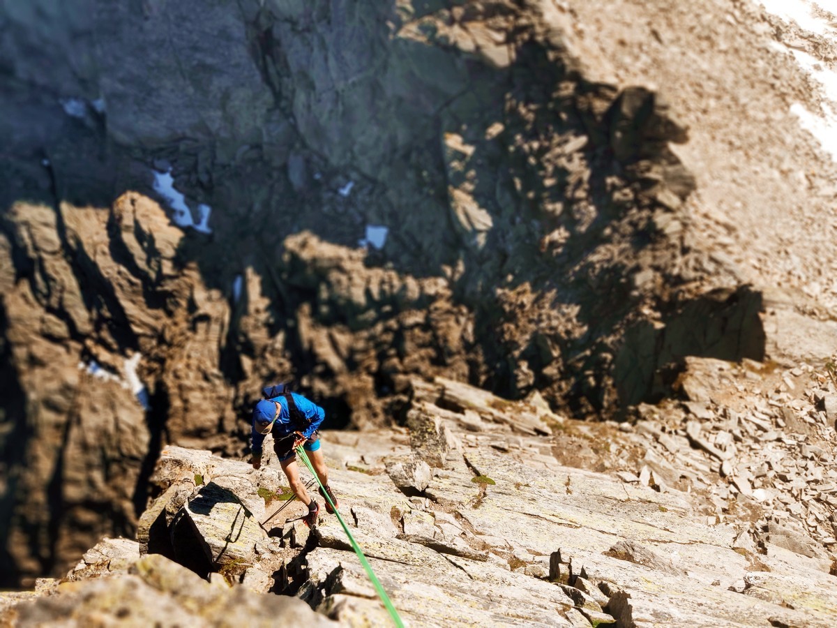 - Danach ist entweder die direkte Linie über den Südgrat (UIAA 5) möglich oder eine lange Querung nach links (Gehgelände bis UIAA 2+) mit abschließender Querung über eine breites Band nach rechts (Gehgelände und kurze Kletterstellen bis 2-).