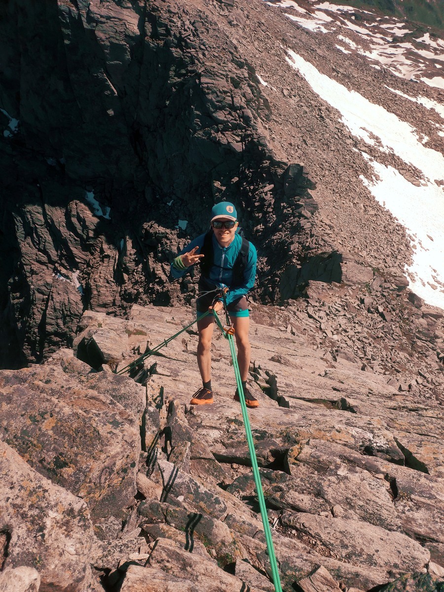 - Mit einem 60-Meter-Seil über den Südgrat abseilen.