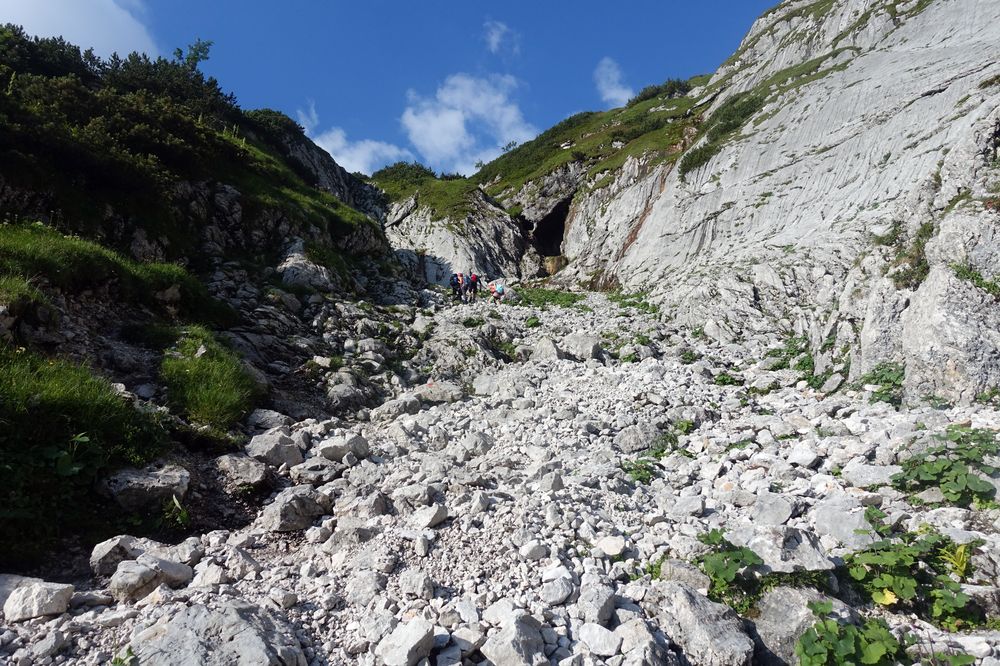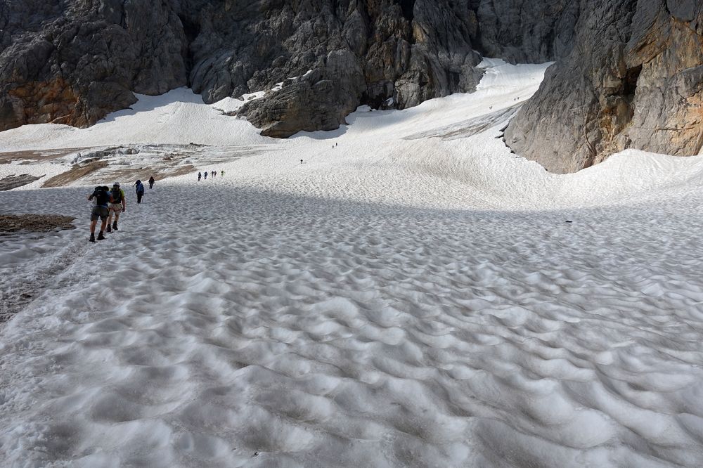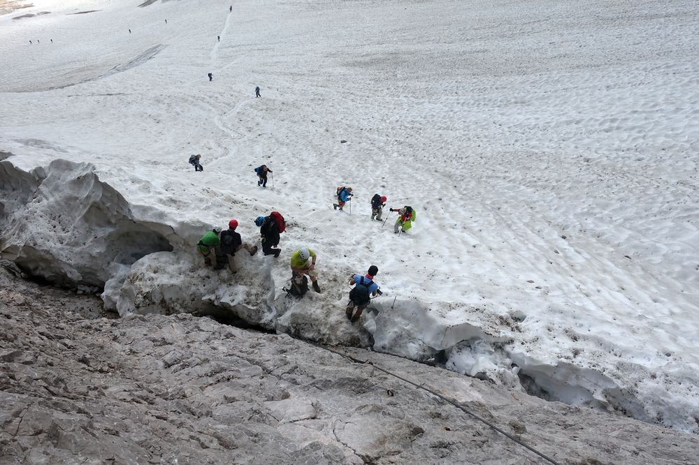 Unbedingt vorher über die Bedingungen informieren. Vor allem am Einstieg zum Klettersteig. Je nach Bedingungen sind Steigeisen notwendig oder auch nicht. Am Klettersteig, je nach Können und Erfahrung mit Klettersteig-Set oder ohne.