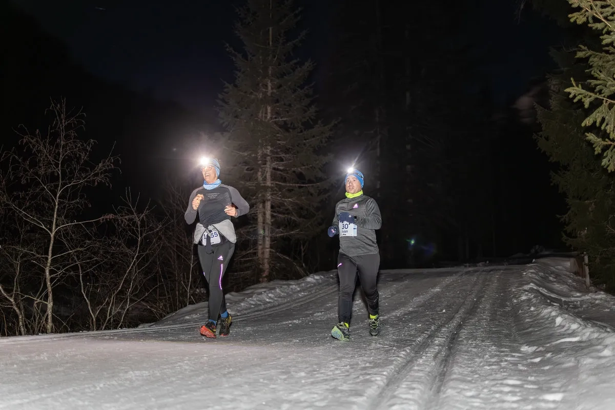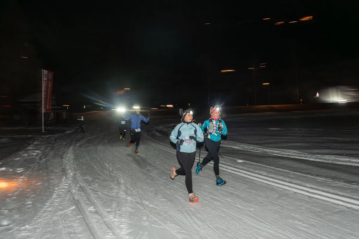 Am Talschluss wartet der Wendepunkt. Keine große Show, kein Lärm. Ein kurzer Moment zum Sammeln, dann geht es auf derselben Route zurück. Beim Drei Zinnen Winter Night Run fühlt sich der Rückweg anders an: vertrauter, schneller, kontrollierter. Die Beine arbeiten, der Kopf weiß, was kommt.