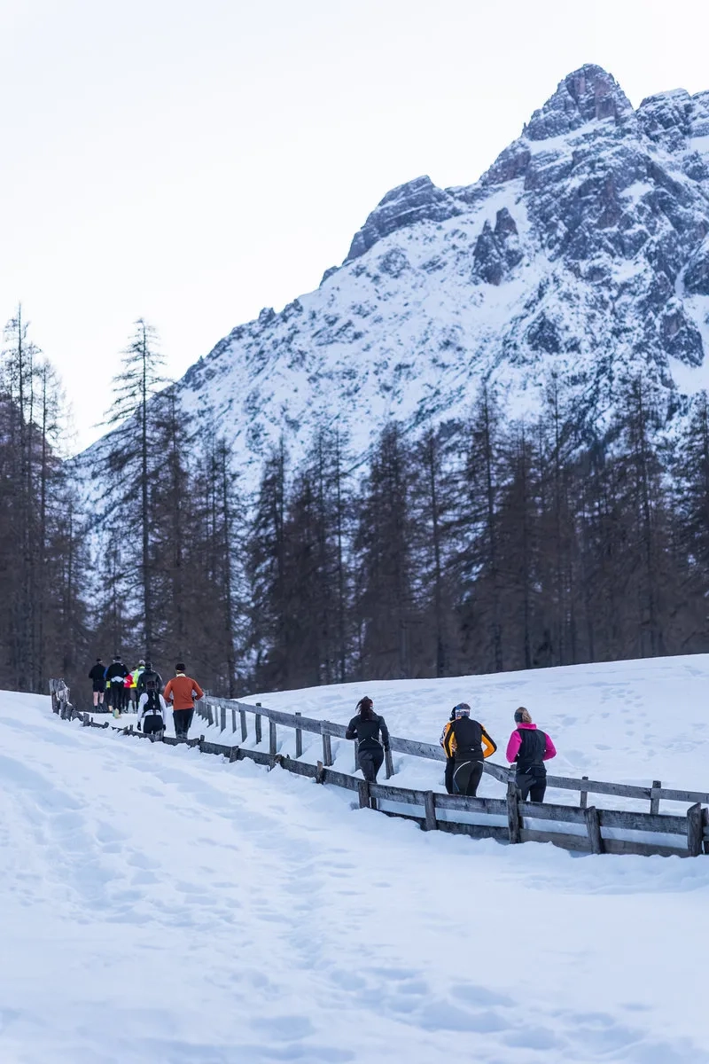 Der Drei Zinnen Winter Night Run bleibt seiner Linie treu. Leichte Anstiege wechseln sich mit flüssigen Passagen ab, zwischendurch sorgt ein Abschnitt auf dem Winterwanderweg für Abwechslung unter den Füßen. Vorbei an Hütten und offenen Flächen öffnet sich das Tal immer weiter, bis der Zwölferkofel plötzlich über dir steht. Kein Kommentar nötig – der Blick reicht.
