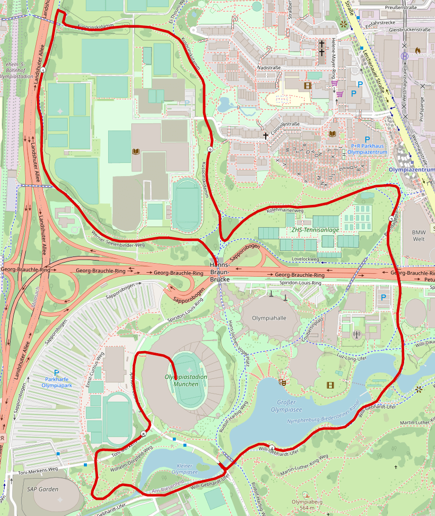 Streckenverlauf: Werner-Seelenbinder-Weg - Landshuter Allee - Kusocinskidamm - Kohlmainenweg - Lilian-Board-Weg - Willi-Gebhardt-Ufer - Olympiastadion