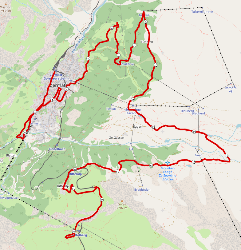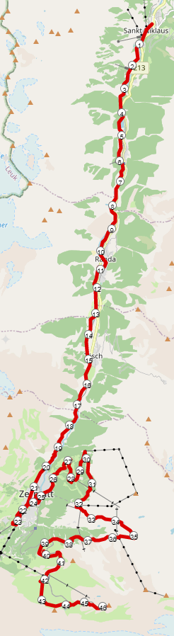 Der Lauf beginnt in St. Niklaus auf einer Höhe von 1.116 Metern und führt über Zermatt auf die Riffelalp auf einer Höhe von 2.222 Metern.