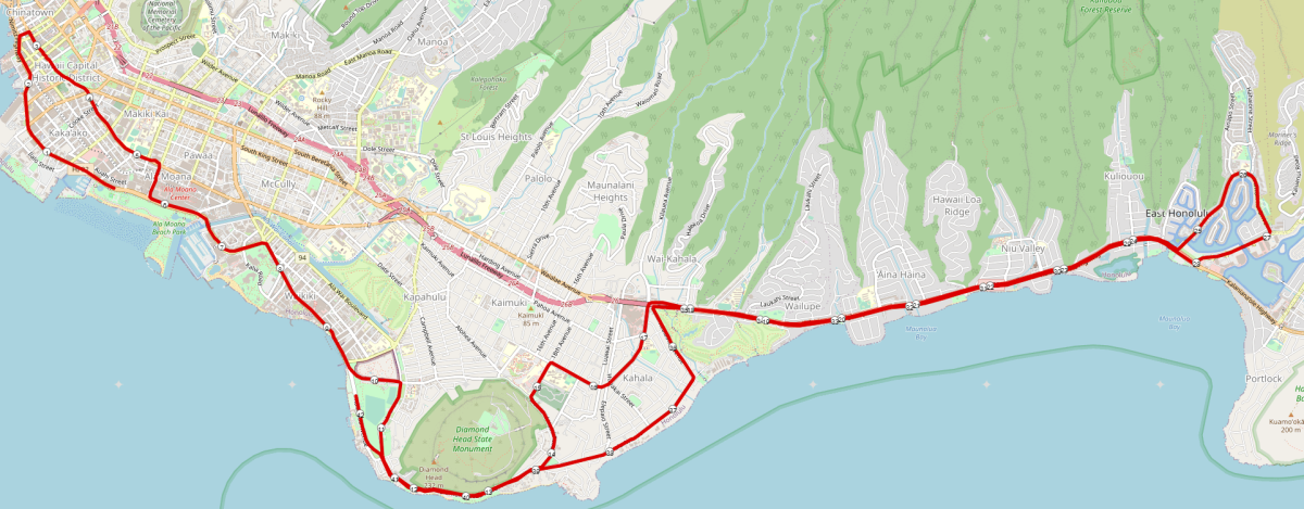 Streckenplan mit Karte und Höhenprofil: Strecke Honolulu Marathon