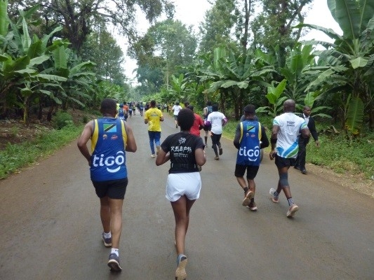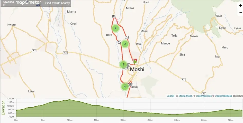 Leaves stadium then goes uphill towards Kilimanjaro before turning around and completing the final 15 km downhill back to the stadium. Runs through coffee and banana plantations, the city of Moshi and offers runners picturesque views of Kilimanjaro.