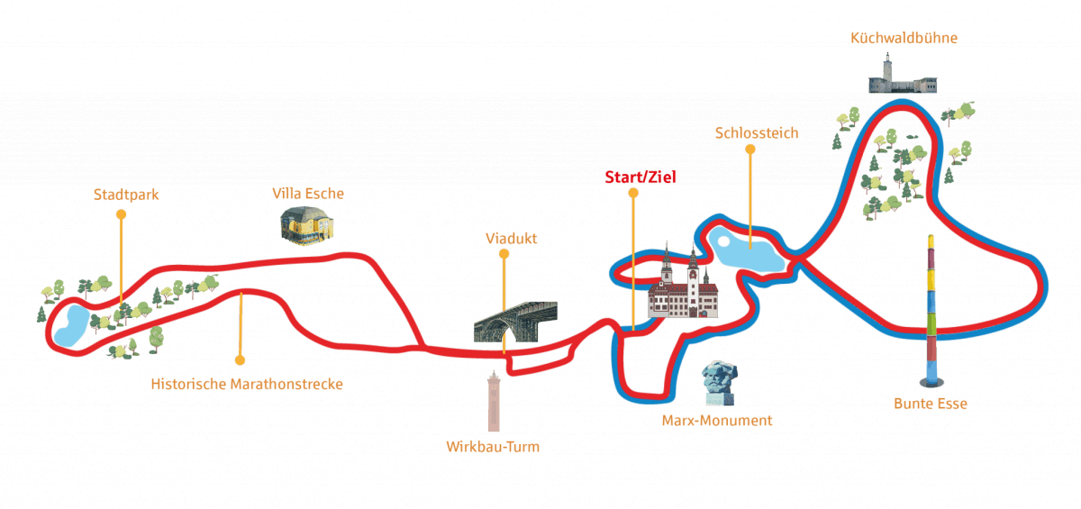 Mit 42,2 Kilometern stellt der Marathon eine echte Herausforderung dar. Die Strecke führt euch aus der Chemnitzer Innenstadt durch den Norden und Süden der Stadt. Unterwegs sorgen kulturelle Sehenswürdigkeiten wie das Karl-Marx-Monument, die Hartmannfabrik und die Oper für Motivation und Abwechslung.