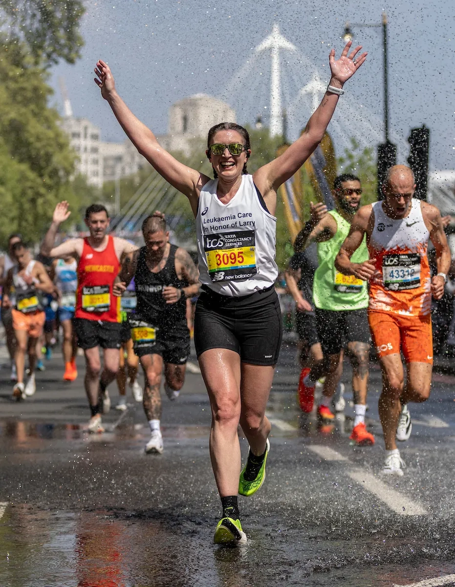 London Marathon 2025: Die Läufer genießen die kühlende Wasserdusche, während sie auf dem Embankment entlanglaufen (Foto: © TCS London Marathon)