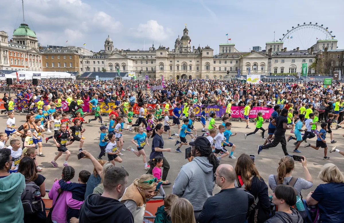 London Marathon 2025: Gesamtansicht des Startbereichs, während eine Welle von Teilnehmern an der Horse Guards Parade während des TCS Mini London Marathon (Foto: © TCS London Marathon)
