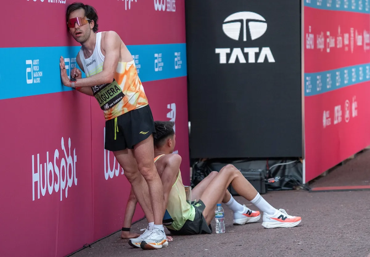 London Marathon 2025: Marcelo Laguera (MEX) lehnt sich gegen die Absperrung, während Alex Yee (GBR) sich entspannt (Foto: © TCS London Marathon)