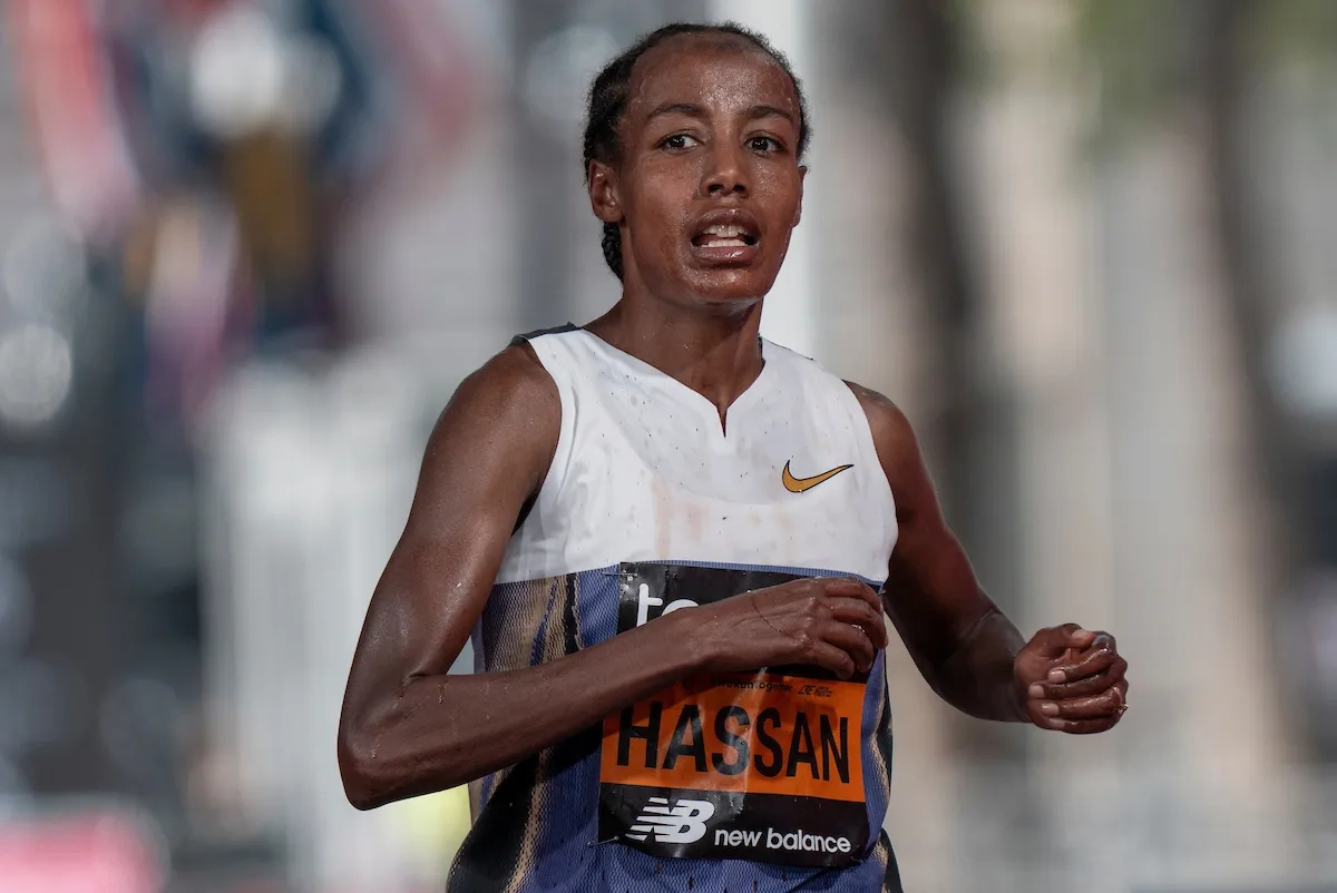 London Marathon 2025: Sifan Hassan (NED) überquert die Ziellinie auf der Mall und belegt den dritten Platz (Foto: © TCS London Marathon)