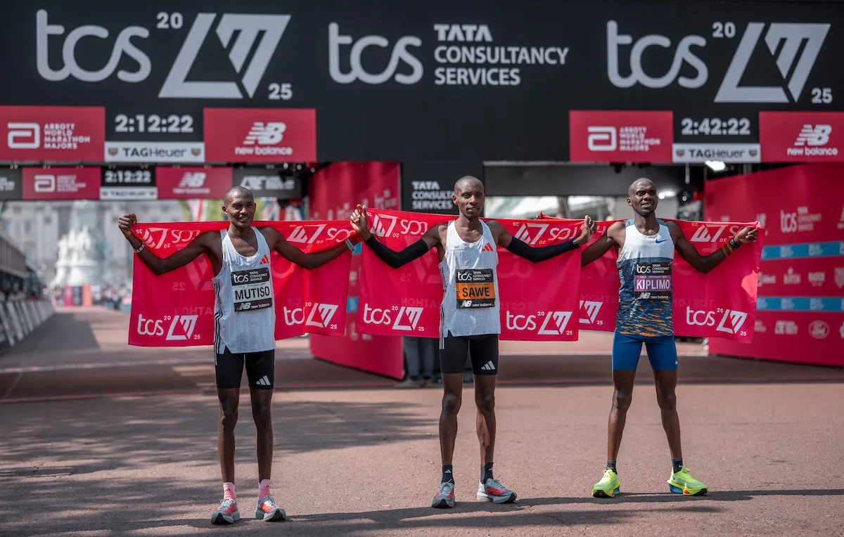 London Marathon 2025: Alexander Mutiso (KEN) (dritter Platz), Sabastian Sawe (KEN) (Sieger) und Jacob Kiplimo (UGA) posieren für Fotos auf der Mall (Foto: © TCS London Marathon)