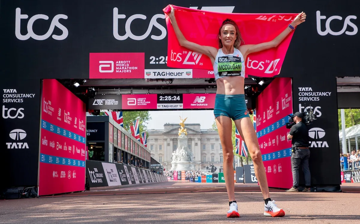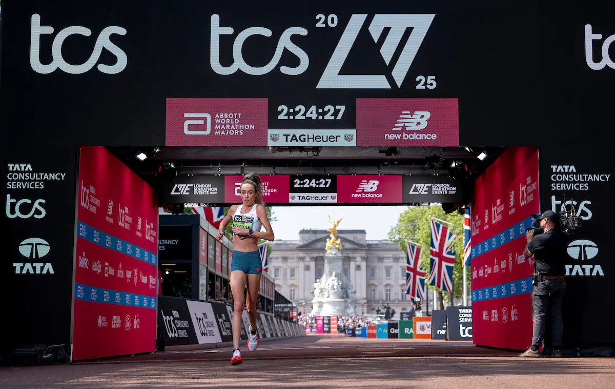 London Marathon 2025: Eilish McColgan (GBR) überquert die Ziellinie auf der Mall vor dem Buckingham Palace (Foto: © TCS London Marathon)