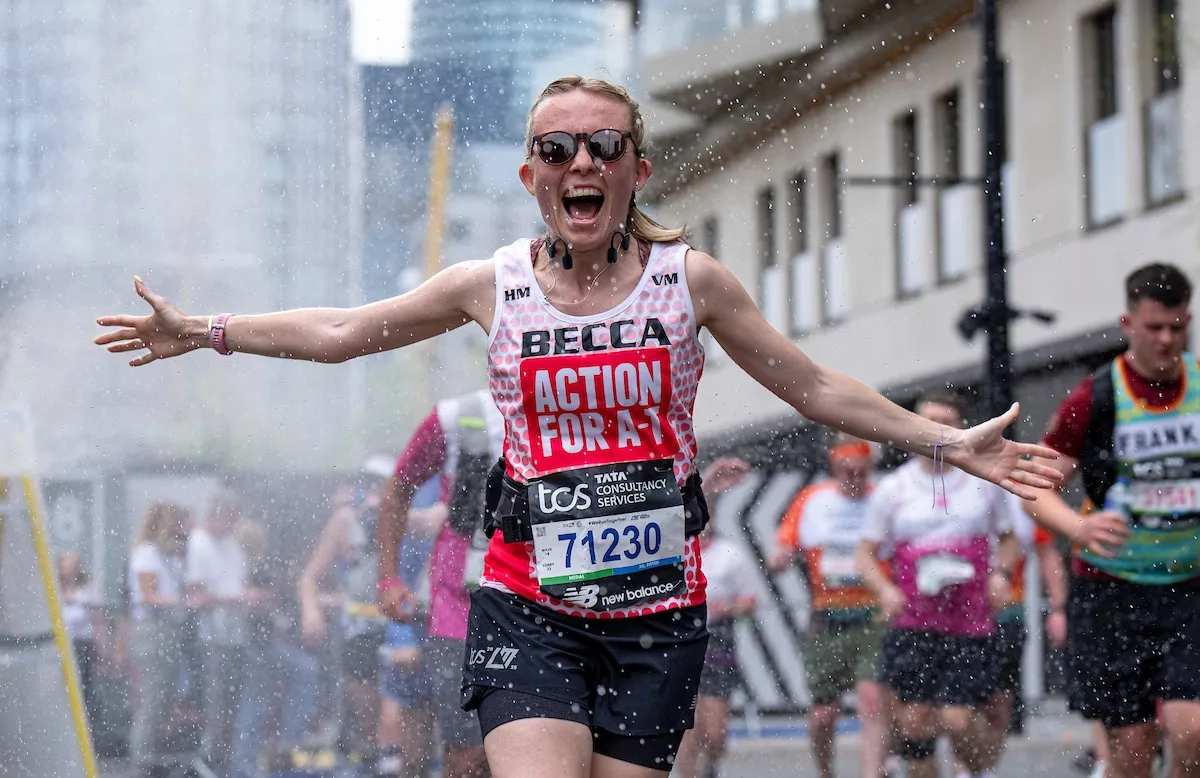 London Marathon 2025: Teilnehmer laufen durch die Gischt in Canary Wharf (Foto: © TCS London Marathon)