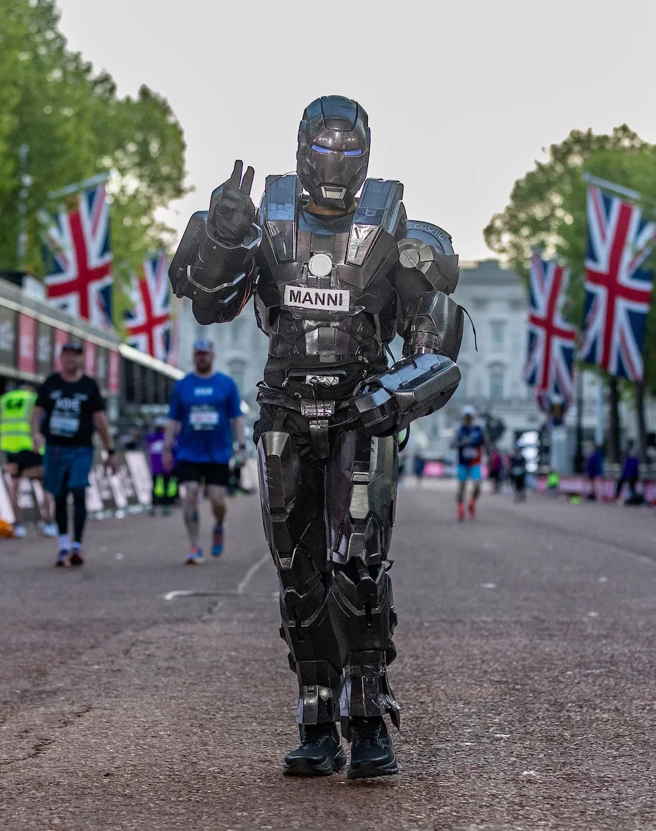 London Marathon 2025: Ein Läufer im Iron-Man-Kostüm läuft bei Sonnenuntergang über die Ziellinie (Foto: © TCS London Marathon)