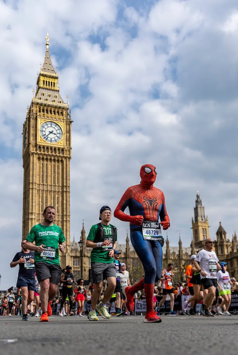 London Marathon 2025: Ein als Spiderman verkleideter Läufer läuft am Big Ben vorbei (Foto: © TCS London Marathon)