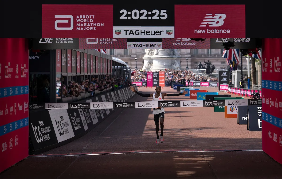 London Marathon 2025: Sabastian Sawe (KEN) überquert die Ziellinie als Sieger (Foto: © TCS London Marathon)