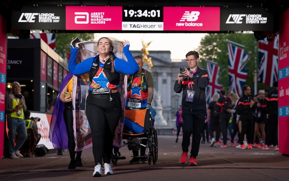 London Marathon 2025: Emily James, die die Make-A-Wish Foundation vertritt, jubelt, als sie zusammen mit Bonnie Jackson und Carl Smith die Ziellinie überquert (Foto: © TCS London Marathon)