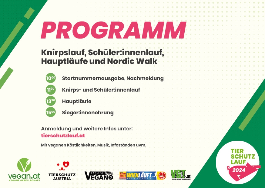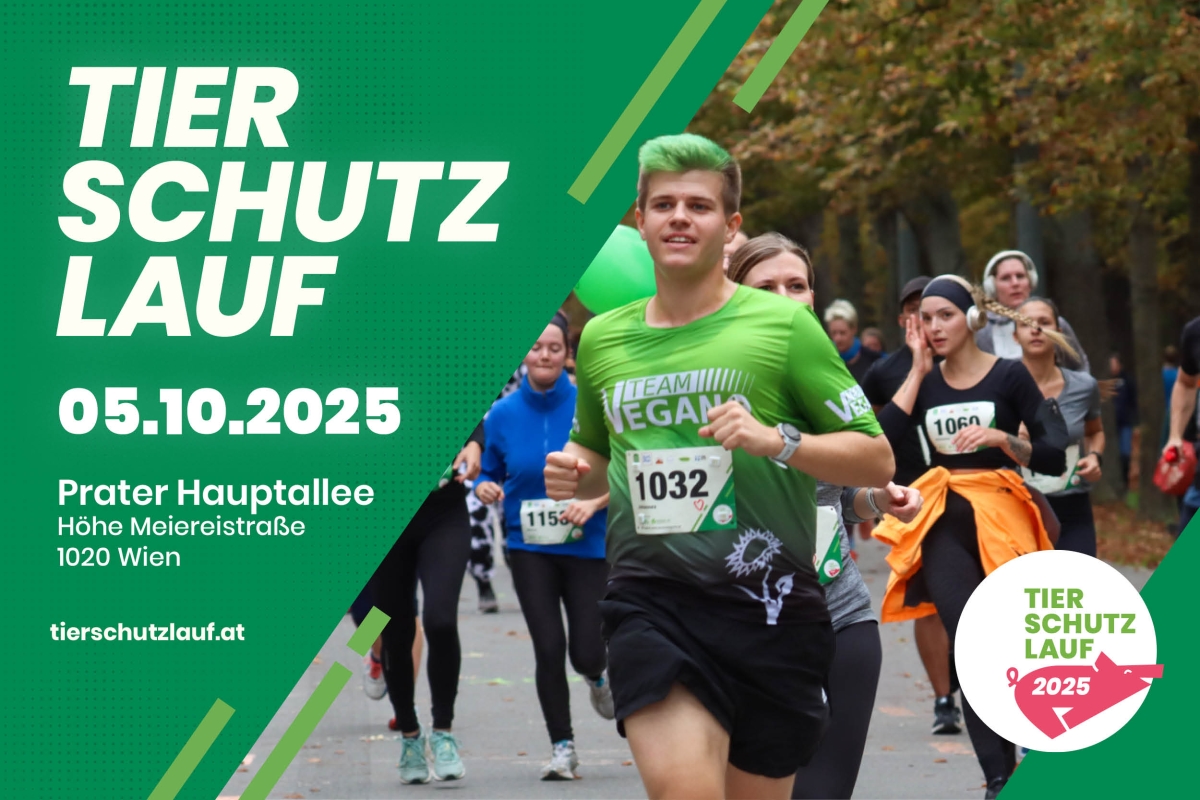 Der Tierschutzlauf hat sich zu einem Pflichttermin für sportliche Tierfreund:innen entwickelt. Am 5. Oktober 2025 gehen auf der Prater Hauptallee wiederum über 1000 Sportbegeisterte für die Tiere an den Start. Mitlaufen dürfen Tierfreund:innen jeden Alters in vier verschiedenen Bewerben von 100 Metern bis zu 10 Kilometern. Der gesamte Erlös kommt den Projekten der Veganen Gesellschaft zugute und unterstützt damit wichtige Tierschutzarbeit.