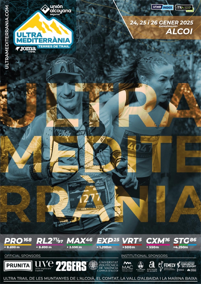 - ONE 90Km: Elevation gain: +4,400m; Maximum time: 21h; When: 01/24/26 at 06:00 a.m. from Gorga 03811, and Finish line in Plaza Ferrándiz y Carbonell, Alcoi (03801).