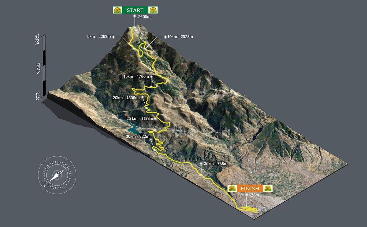 Start auf 2.605 Metern Höhe, Ziel auf 667 Metern Höhe.