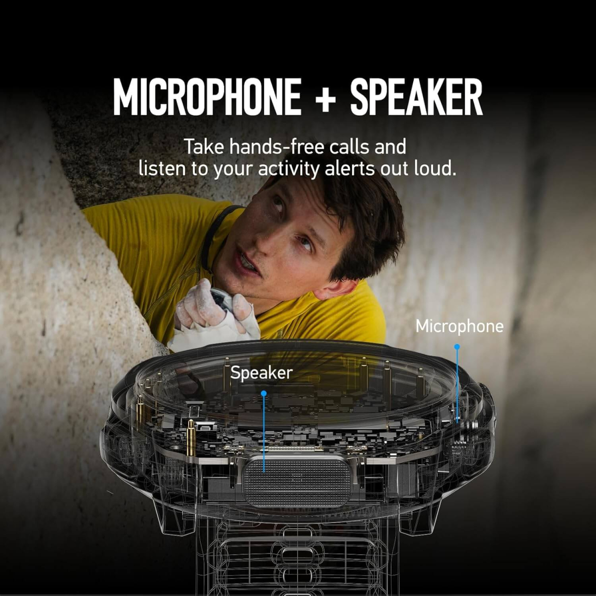 Das integrierte Mikrofon ermöglicht dir, Sprachnotizen direkt an der Wand oder während eines langen Laufs aufzuzeichnen. Halte Informationen fest, die du beim nächsten Mal brauchen könntest. Der Lautsprecher lässt dich freihändig telefonieren und spielt Aktivitätsalarme direkt auf der Uhr ab.