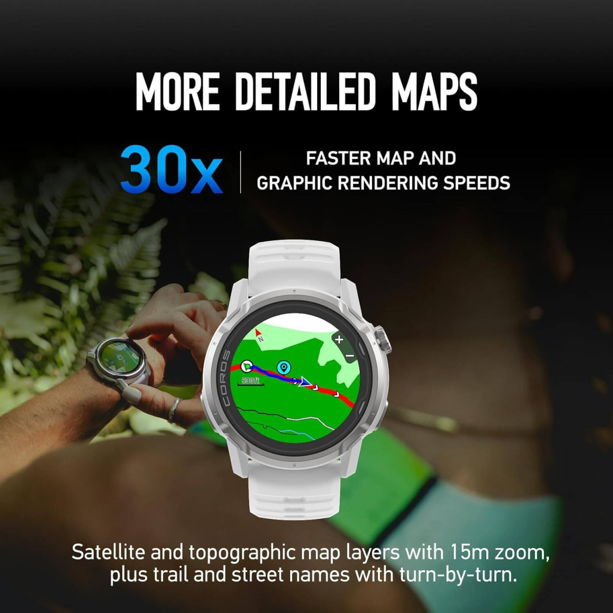 Zwei Kartenebenen mit 15 m Zoom zeigen dir topografische Details, Straßen- und Trailnamen. Die Echtzeit-Karten-Engine zeigt dir Landscape-, Topo-, Satelliten- und Hydro-Karten sofort an – inklusive Abbiegehinweisen und Points of Interest. So bleibst du auf Trails, in der Stadt oder auf der Piste immer auf Kurs.