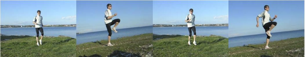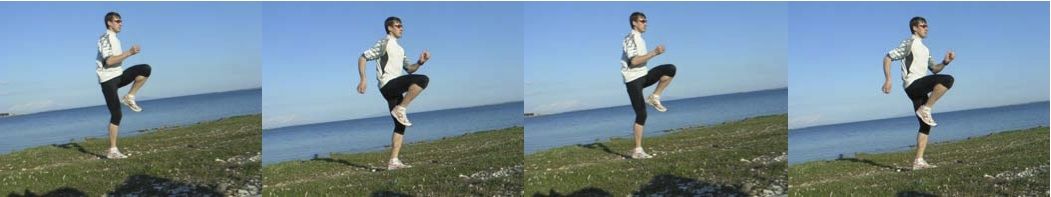 Another essential exercise. At a slow running pace, lift the knee of the swinging leg to a right angle. Move the arms actively. Keep torso and hips upright. Variation is possible. Two lifts on the same side add extra coordination challenge.