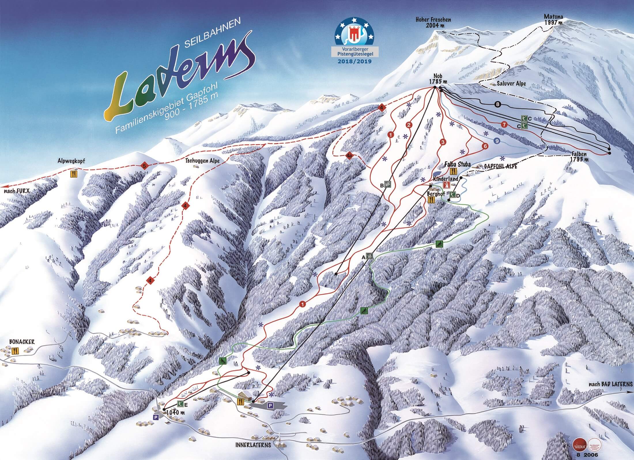 Größe:Das Skigebiet Laterns besteht aus 27,0 Pistenkilometern, davon 8 leichten, 15 mittleren und 4 schweren Pistenkilometern.