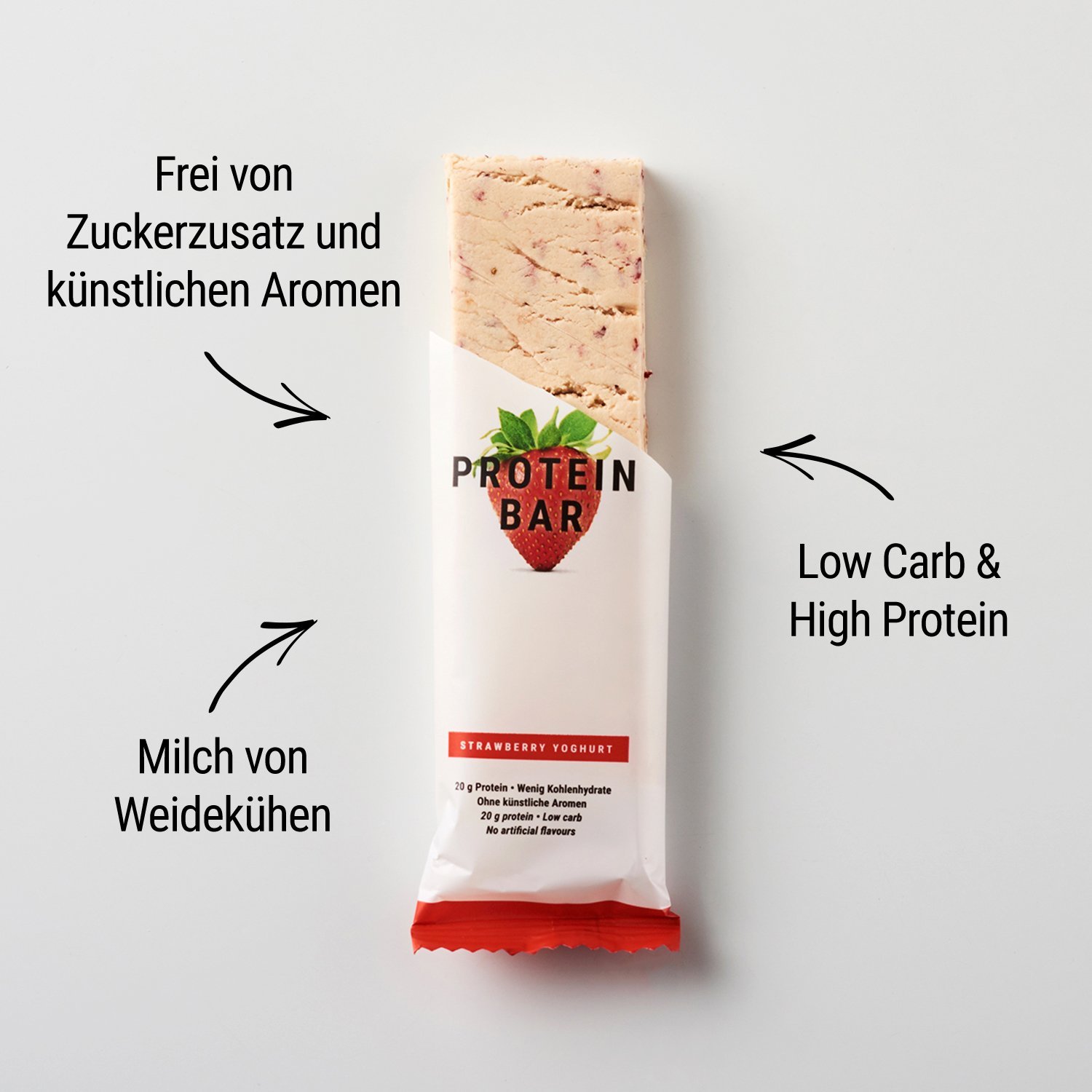 Unser foodspring Proteinbar hat 20g Protein und 10,5g Ballaststoffe pro Portion und besticht mit seinem einzigartigen Geschmack