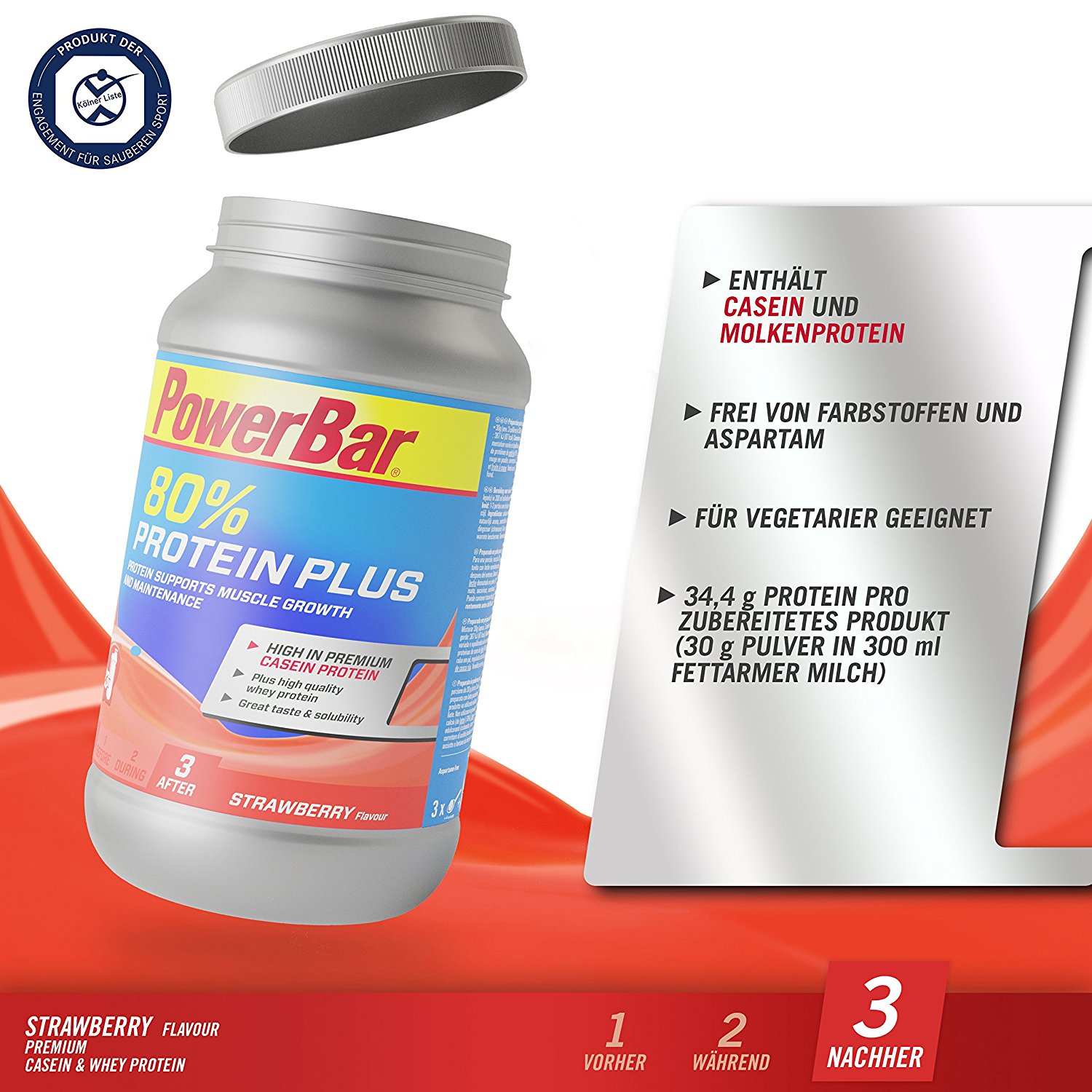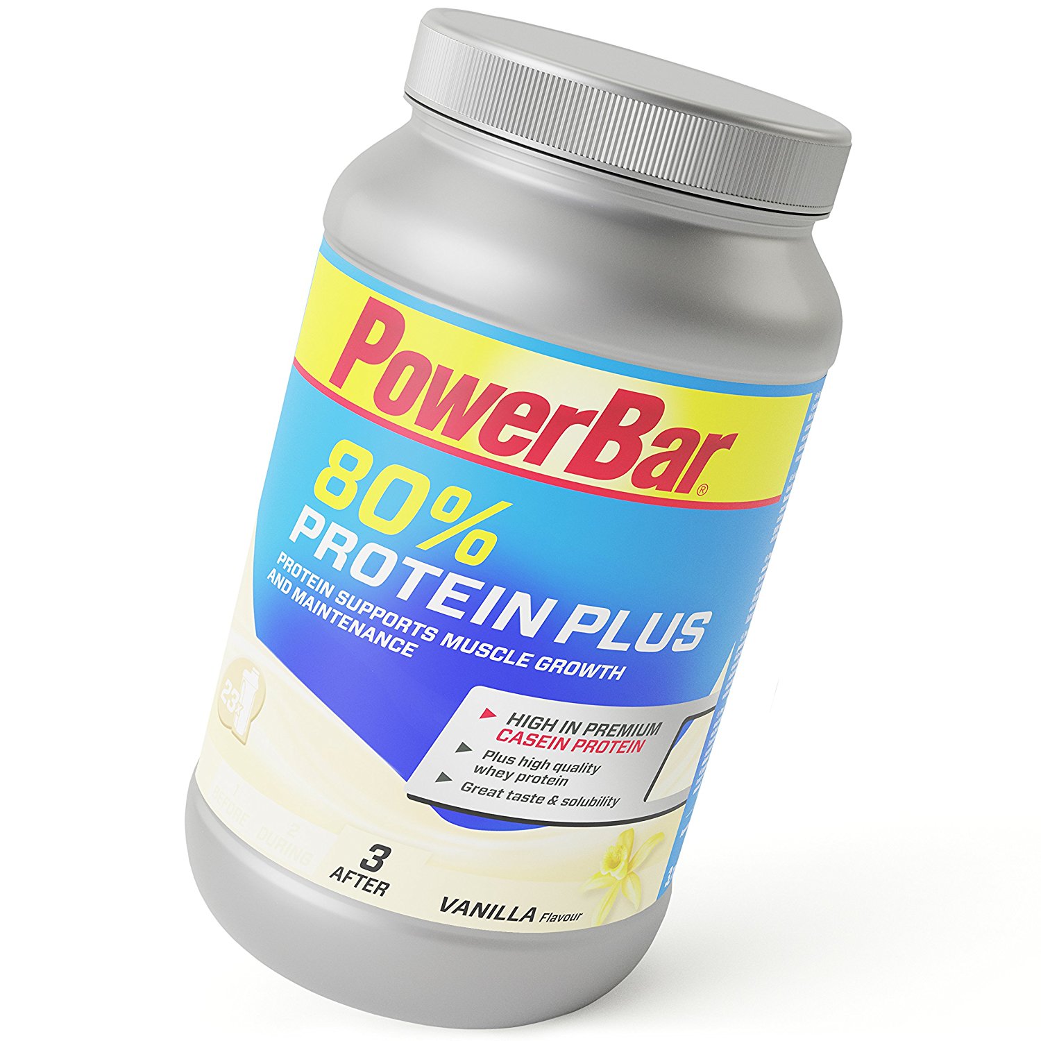 Das PowerBar Protein Plus 80% ist eine gute Wahl nach dem Sport und vor dem Schlafen, um dem Körper hochwertiges Protein mit einem hohen Anteil an langsam verdaulichem Casein zur Verfügung zu stellen. Nährwerte: 34 g Protein, ca. 17 g Kohlenhydrate und 6 g Fett pro Portion (wenn mit fettarmer Milch angerührt). Das Protein unterstützt den Muskelaufbau und Muskelerhalt.