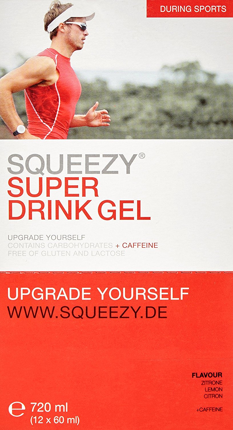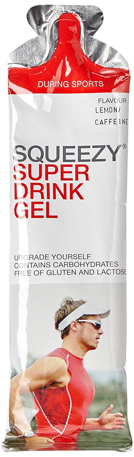 SQUEEZY - der Erfinder kohlenhydratreicher Energie Gels für Ausdauersportler (1987) bietet auch eine Gelvariante an, bei der kein Nachtrinken von Wasser notwendig ist. Das SQUEEZY DRINK GEL Geschmack Zitronen/Koffein im 60-ml-Beutel enthält 20 g Kohlenhydrate. Das vegane DRINK GEL ist frei von Fruktose, Laktose, Gluten und künstlichen Süß- und Farbstoffen.