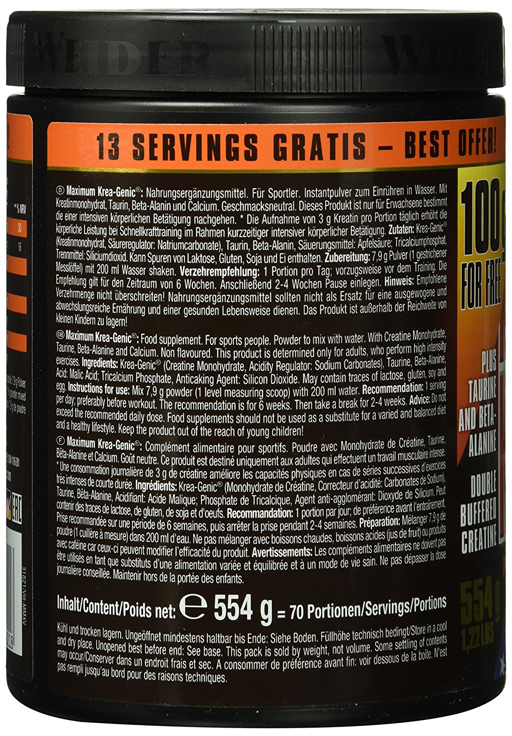 Maximum Krea-Genicenthält extra wenig Kohlenhydrate, ausschließlich reines Krea-Genic, sowie Calcium, Taurin und Alanin